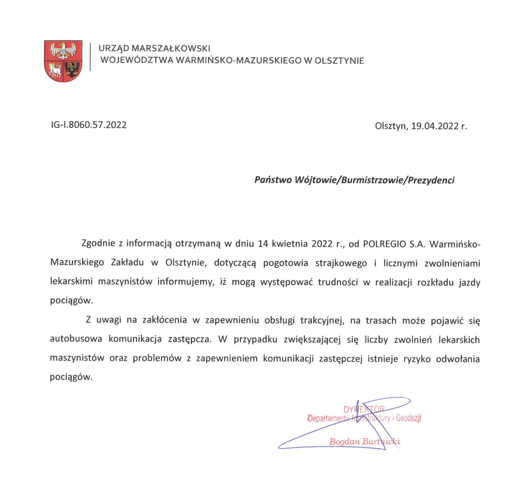 Zgodnie z informacją otrzymaną od POLREGIO SA Warmińsko Mazurskiego Zakładu w Olsztynie informujemy, iż mogą wystąpić trudności w realizacji rozkładu jazdy pociągów. Z wagi na zakłócenia informujemy, iż na trasach może pojawić się autobusowa komunikacja zastępcza. W przypadku zwiększającej się liczby zwolnień lekarskich maszynistów oraz problemów z zapewnieniem komunikacji zastępczej istnieje ryzyko odwołania pociągów.