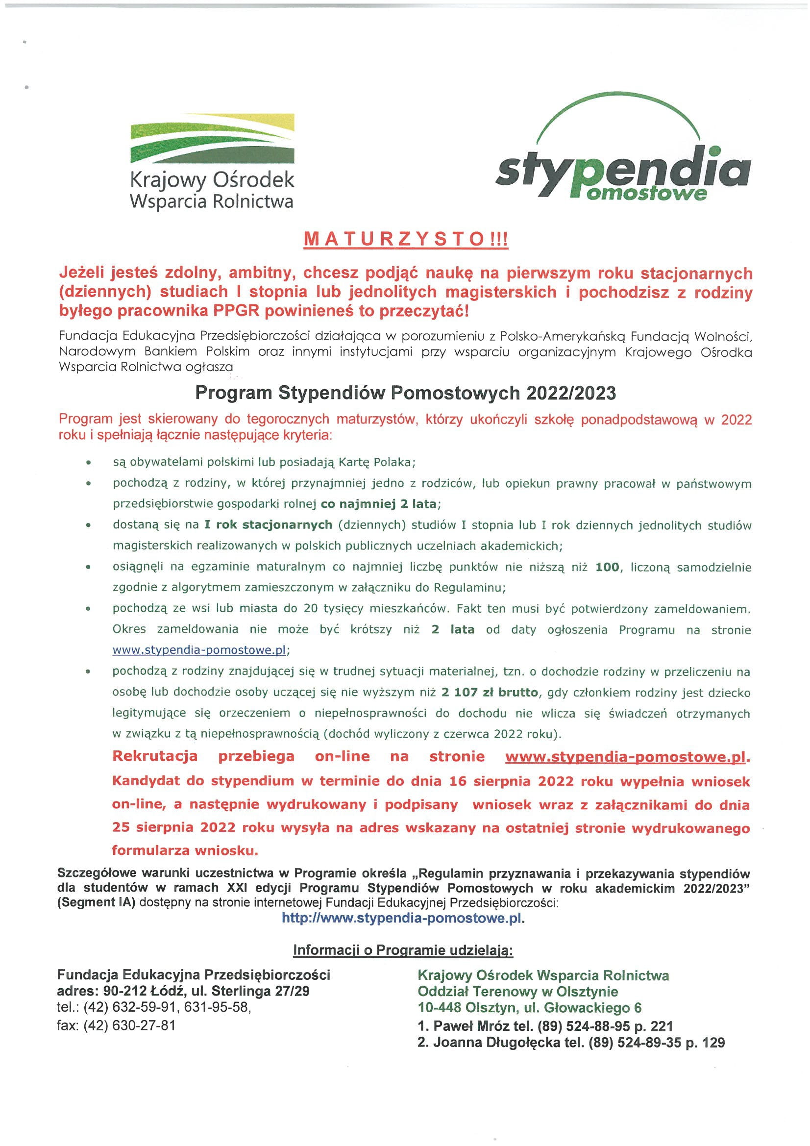 Krajowy Ośrodek Wsparcia Rolnictwa Oddział Terenowy w Olsztynie wzorem lat poprzednich uprzejmie informuje, że rozpoczęła się realizacja XXI edycji Programu Stypendiów Pomostowych skierowanego do tegorocznych maturzystów pochodzących z rodziny byłego pracownika PGR, którzy rozpoczną naukę .na studiach stacjonarnych I stopnia lub jednolitych magisterskich realizowanych w polskich uczelniach akademickich.