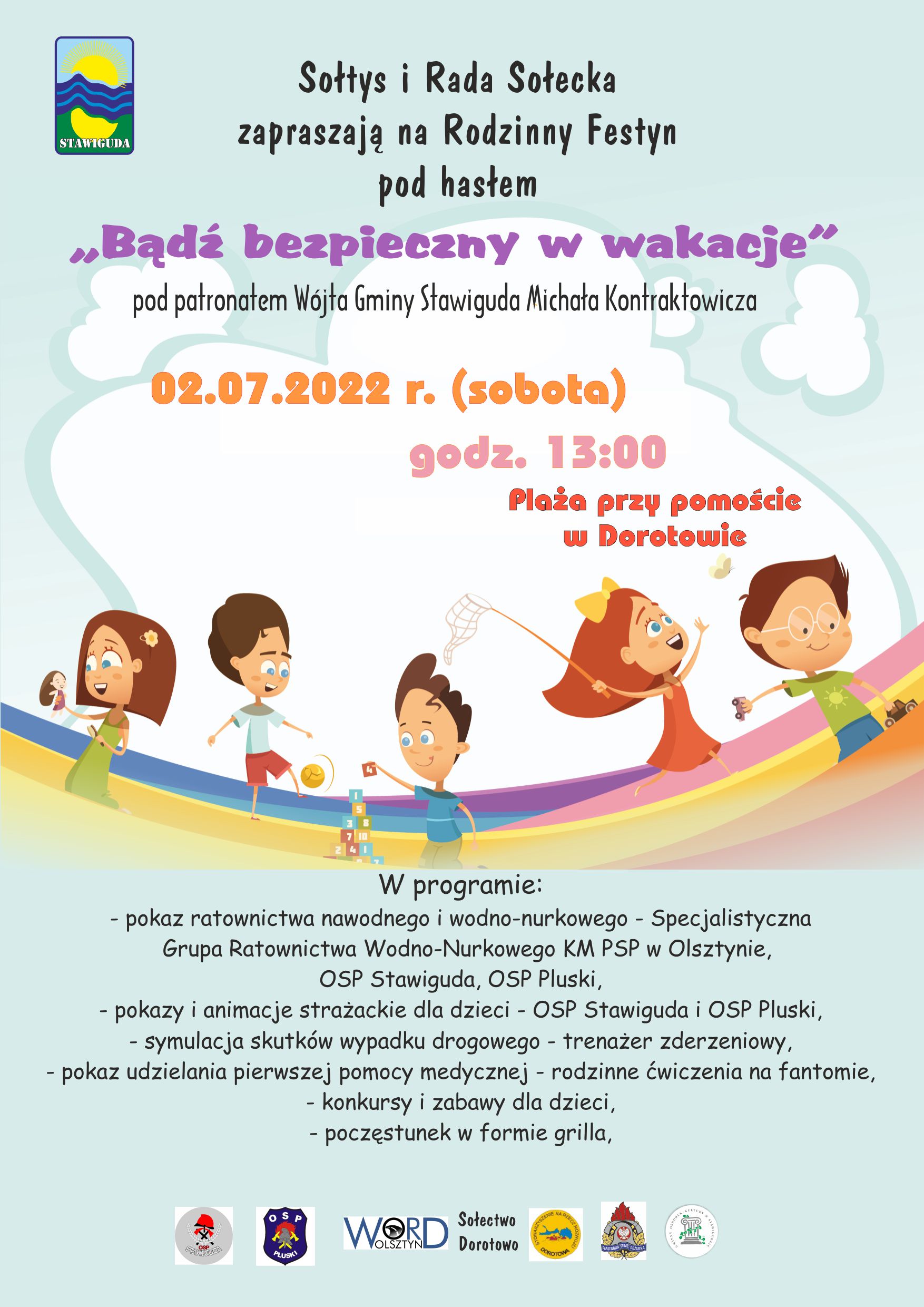 W imieniu Sołtysa oraz Rady Sołeckiej Dorotowa zapraszamy na Rodzinny Festyn "Bądź bezpieczny w wakacje"! który odbędzie się już 2 Lipca o godzinie 13:00 na Plazy przy Pomoście w Dorotowie! Patronat Honorowy nad Festynem objął Michał Kontraktowicz Wójt Gminy Stawiguda! Szczegółowy Program na poniższym plakacie! Zapraszamy!
