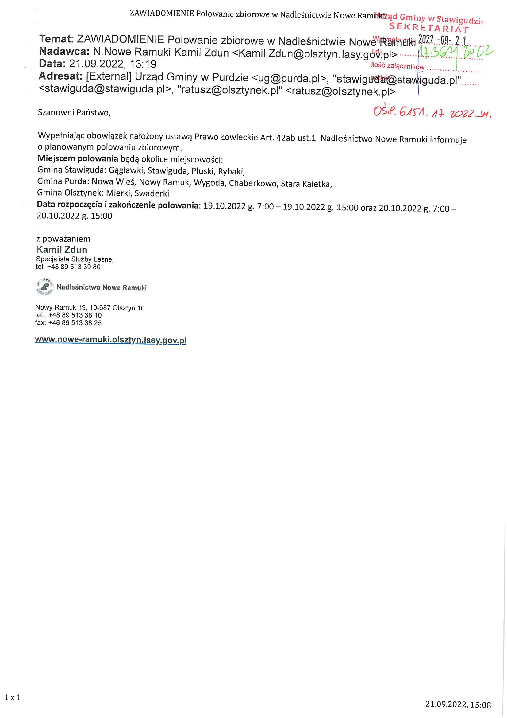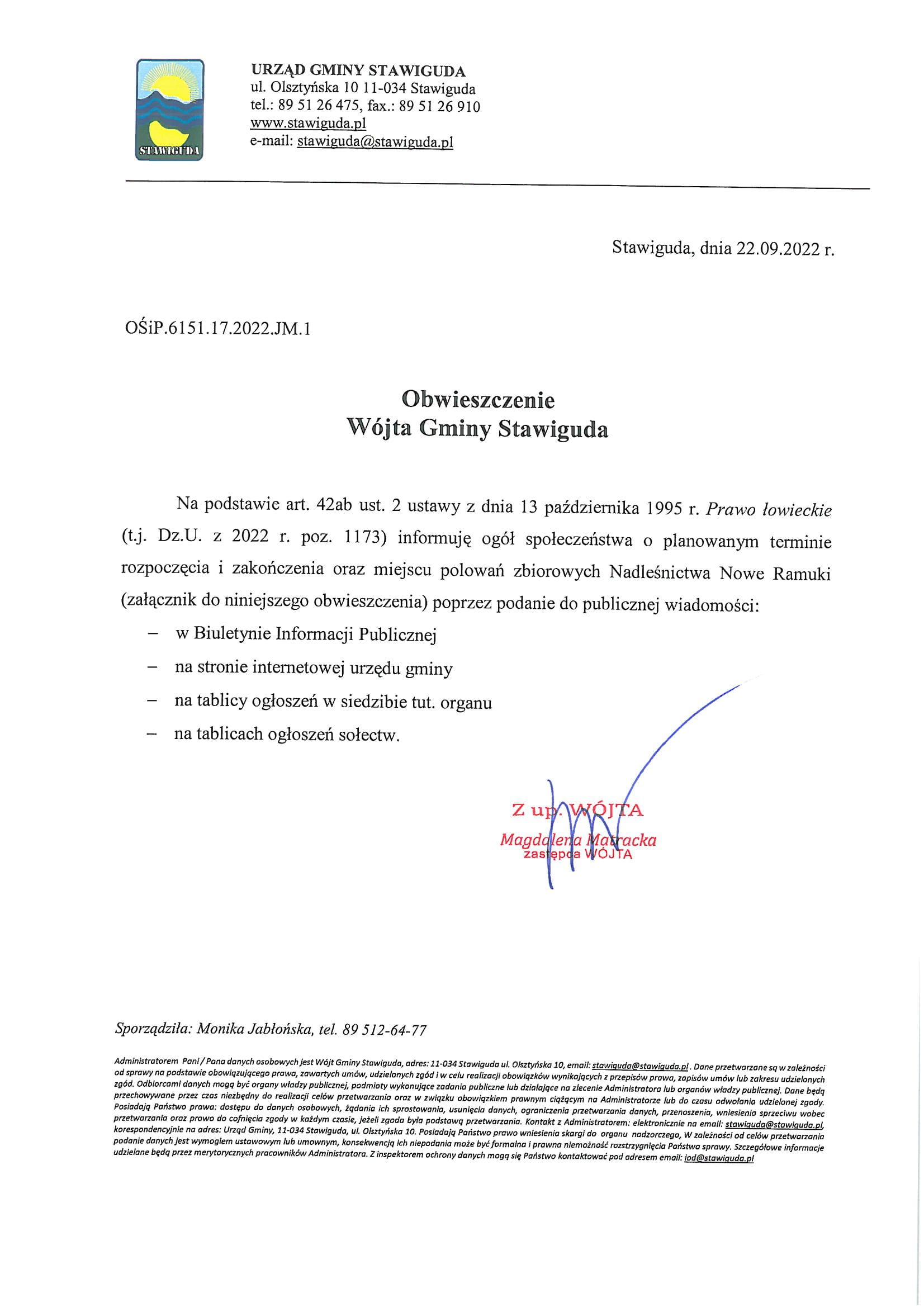OBWIESZCZENIE WÓJTA GMINY STAWIGUDA W SPRAWIE INFORMACJI O PLANOWANYCH TERMINACH ORAZ MIEJSCACH POLOWAŃ ZBIOROWYCH NADLEŚNICTWA NOWE RAMUKI