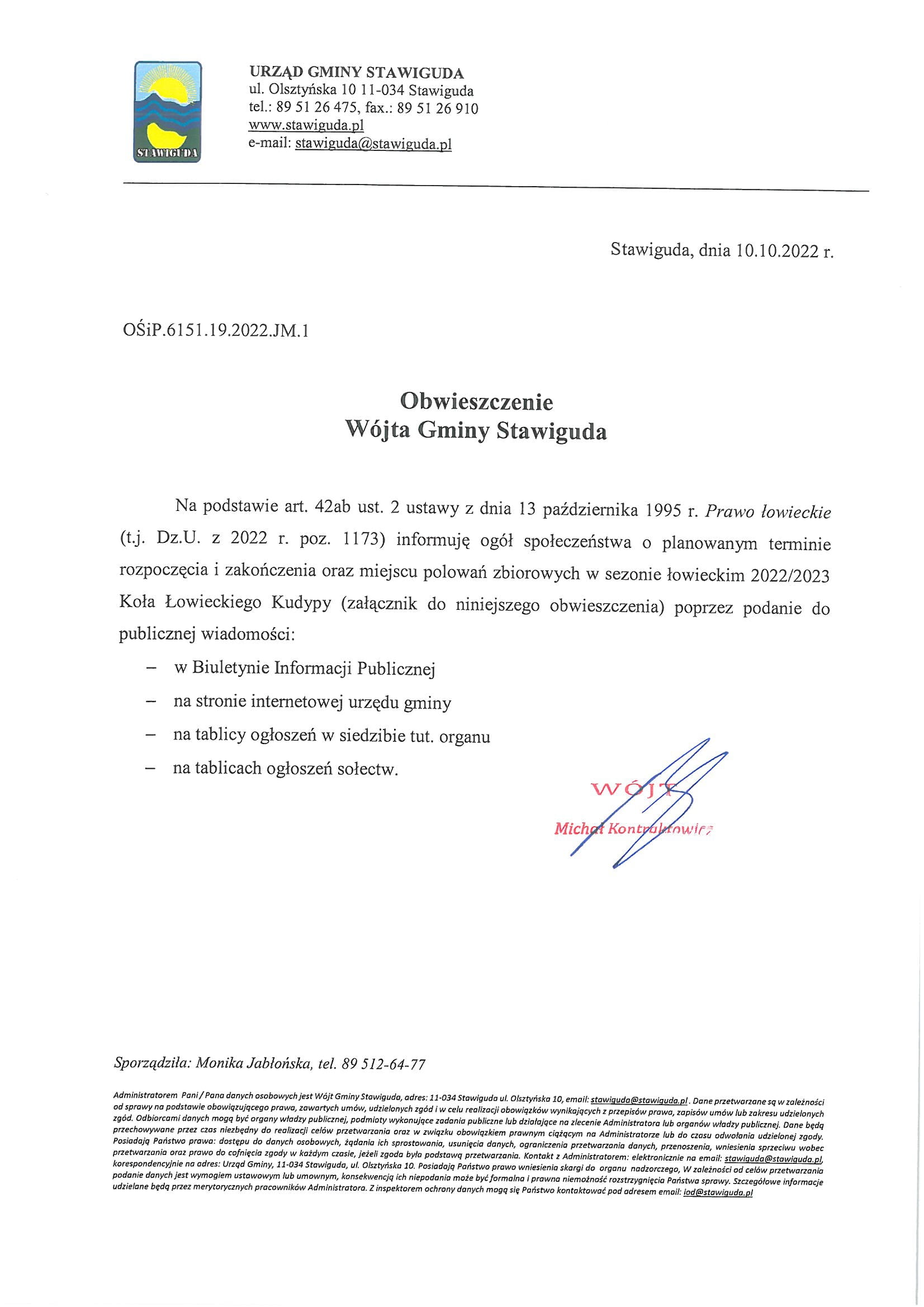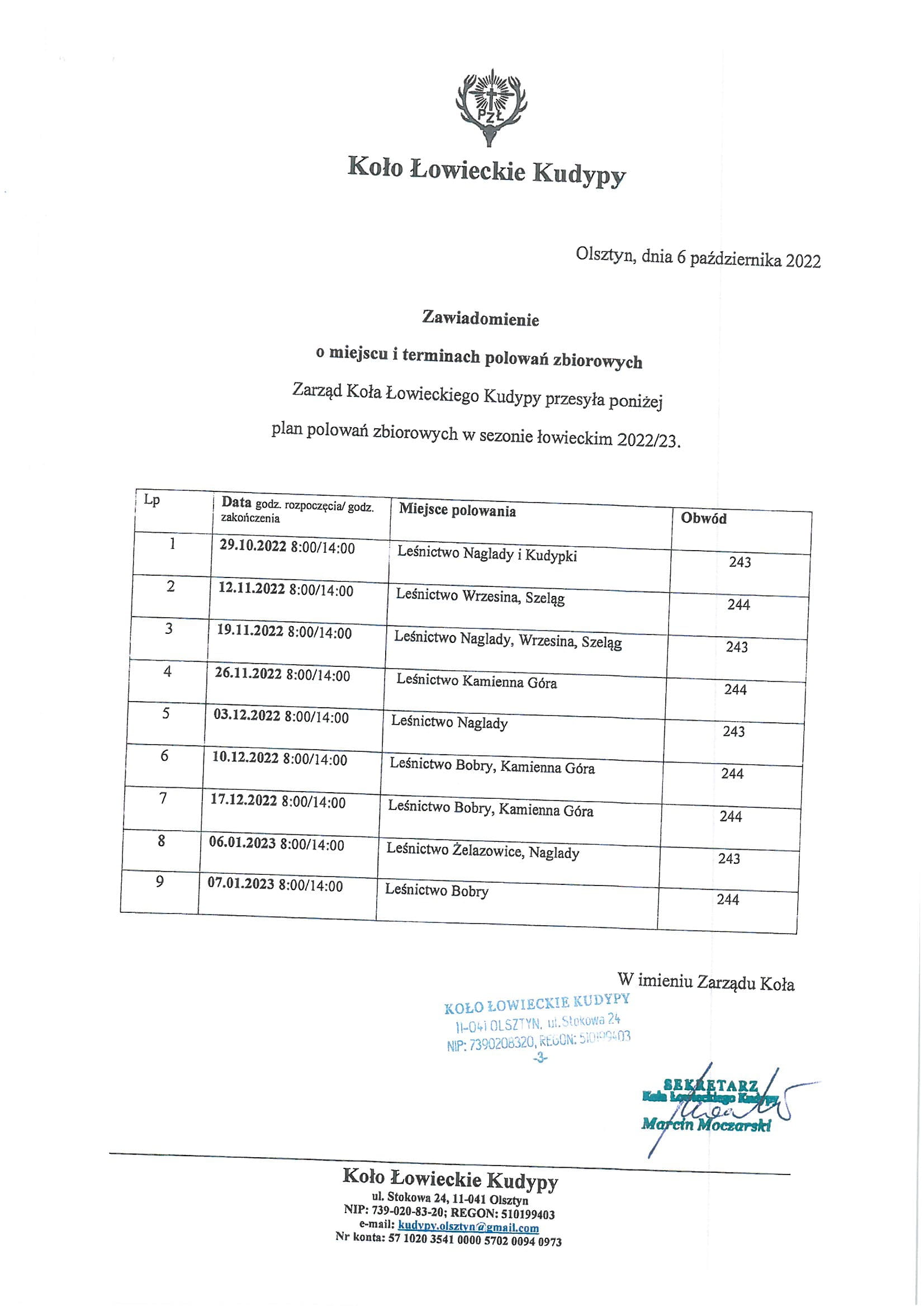 OBWIESZCZENIE WÓJTA GMINY STAWIGUDA W SPRAWIE INFORMACJI O PLANOWANYCH TERMINACH ORAZ MIEJSCACH POLOWAŃ ZBIOROWYCH W SEZONIE ŁOWIECKIM 2022/2023 KOŁA ŁOWIECKIEGO KUDYPY