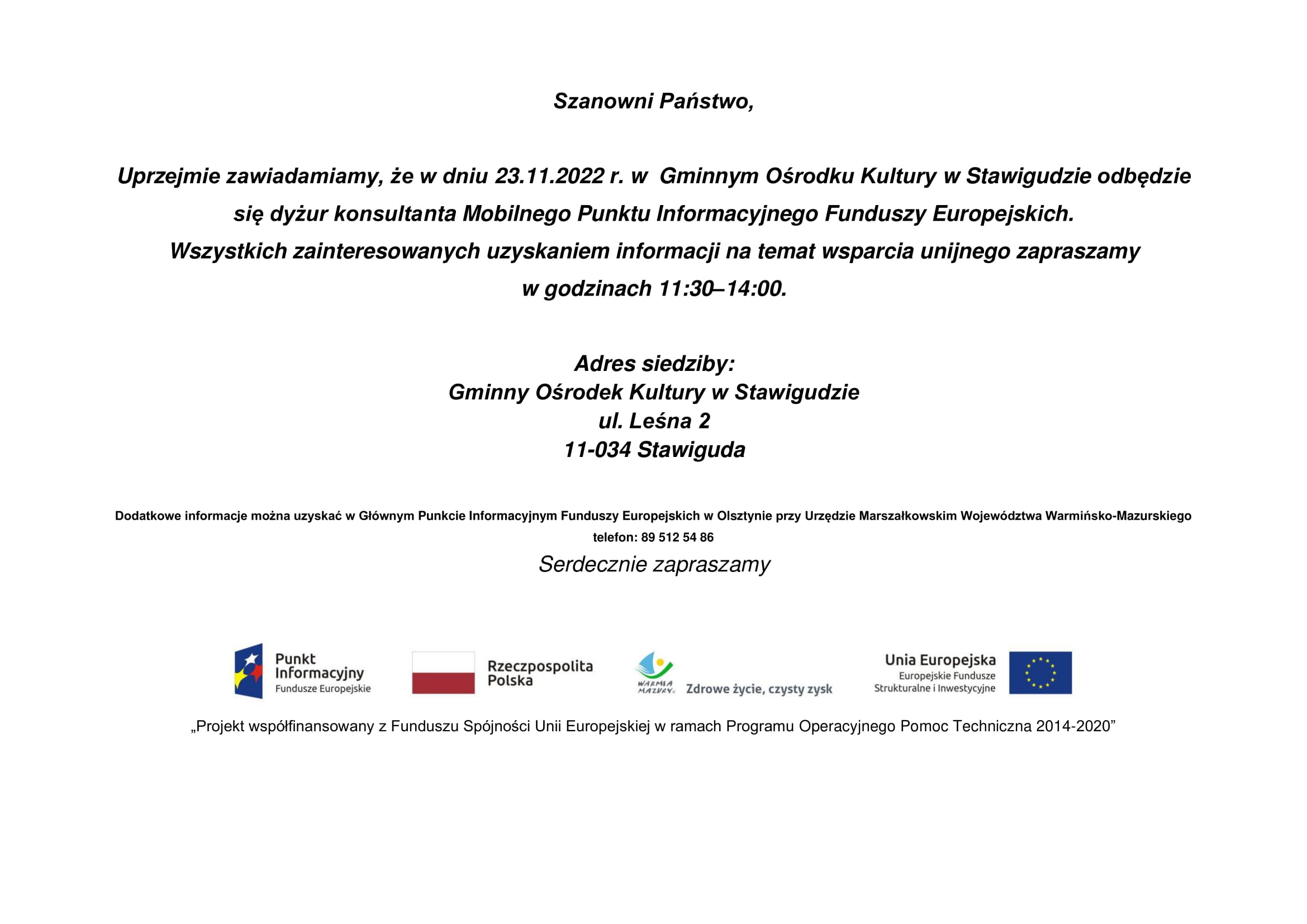 Uprzejmie zawiadamiamy, że w dniu 23.11.2022 r. w  Gminnym Ośrodku Kultury w Stawigudzie odbędzie się dyżur konsultanta Mobilnego Punktu Informacyjnego Funduszy Europejskich. Wszystkich zainteresowanych uzyskaniem informacji na temat wsparcia unijnego zapraszamy w godzinach 11:30–14:00. Adres siedziby: Gminny Ośrodek Kultury w Stawigudzie ul. Leśna 2