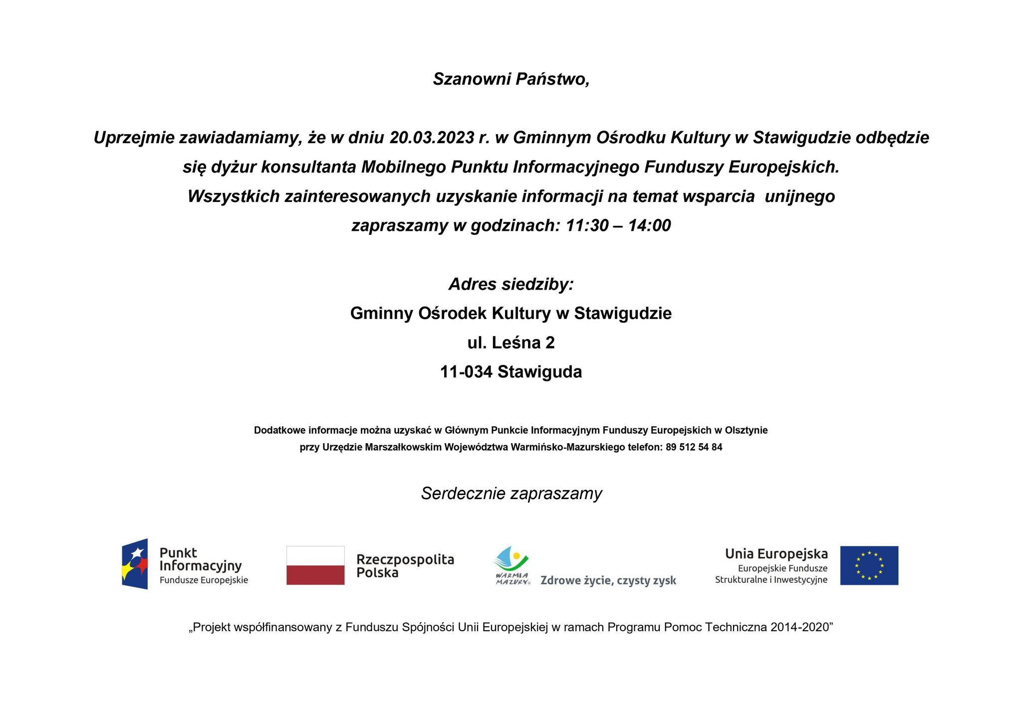 Uprzejmie zawiadamiamy, że w dniu 20.03.2023 r. w Gminny Ośrodek Kultury w Stawigudzie odbędzie się dyżur konsultanta Mobilnego Punktu Informacyjnego Funduszy Europejskich.
