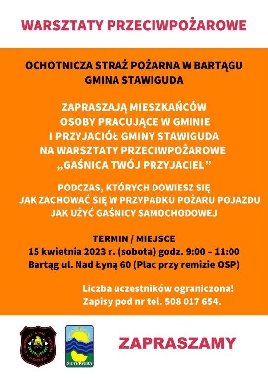 Po sukcesie poprzednich edycji warsztatów przeciwpożarowych "Gaśnica Twój Przyjaciel" Ochotnicza Straż Pożarna w Bartągu, Gmina Stawiguda zapraszają mieszkańców, osoby pracujące w gminie i przyjaciół Gminy Stawiguda w sobotę 15 listopada 2022 r. w godz. 9:00-11:00 do remizy OSP Bartąg na kolejne zajęcia.