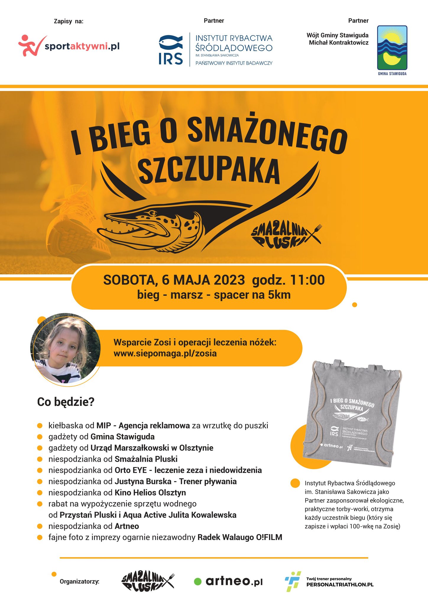 Już w najbliższą sobotę zapraszamy na I Bieg o Smażonego Szczupaka w Pluskach koło Stawigudy. Idea jest prosta-pomagamy Zosi, która pilnie potrzebuje operacji, aby jej nóżki były zdrowe. https://www.siepomaga.pl/zosia W ramach akcji pokonujemy dystans 5️⃣ km po lesie nieważne czy Biegniesz, idziesz, truchtasz, a na mecie czeka na zwycięzcę smaczna nagroda, czyli szczupak? prosto z patelni ?