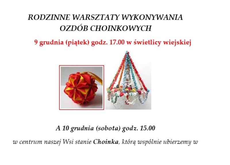 Chcesz poczuć magię Świąt Bożego Narodzenia? Stworzyć własną świąteczną dekorację na Wspólną Wymojską Choinkę? SOŁTYS WSI WYMÓJ I RADA SOŁECKA ORAZ Fundacja na Rzecz Poprawy Jakości Życia „Atvita” zapraszają dzieci, młodzież i dorosłych na RODZINNE WARSZTATY WYKONYWANIA OZDÓB CHOINKOWYCH 9 grudnia (piątek) godz. 17.00 w świetlicy wiejskiej