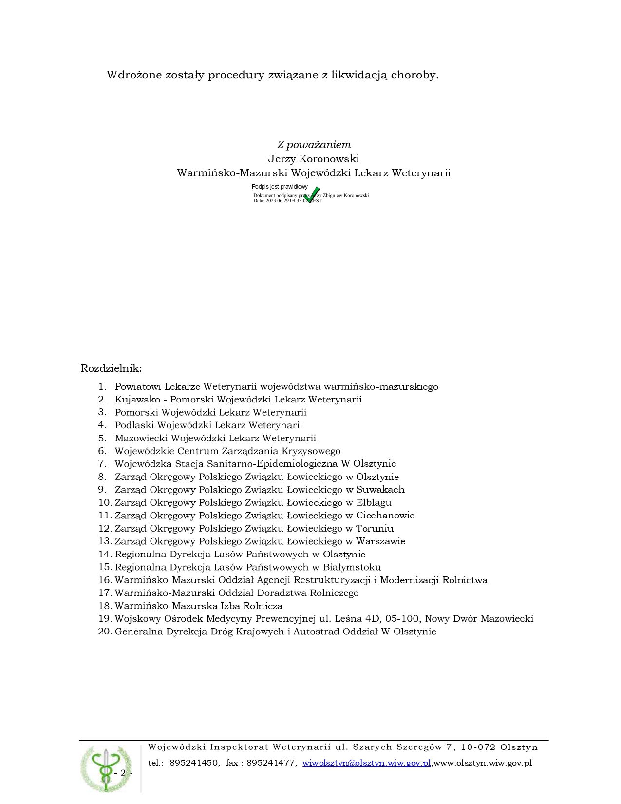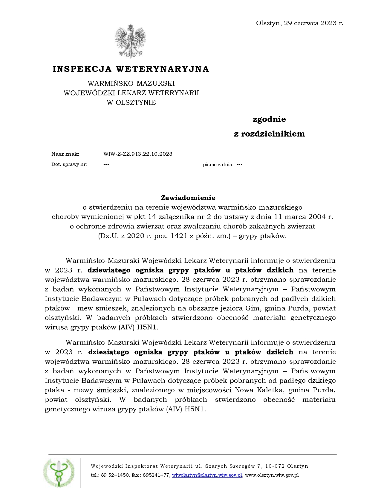 Zawiadomienie Warmińsko-Mazurskiego Wojewódzkiego Lekarza Weterynarii w Olsztynie o wystąpieniu na terenie woj. warmińsko-mazurskiego na terenie gminy Purda ognisk grypy ptaków u ptaków dzikich