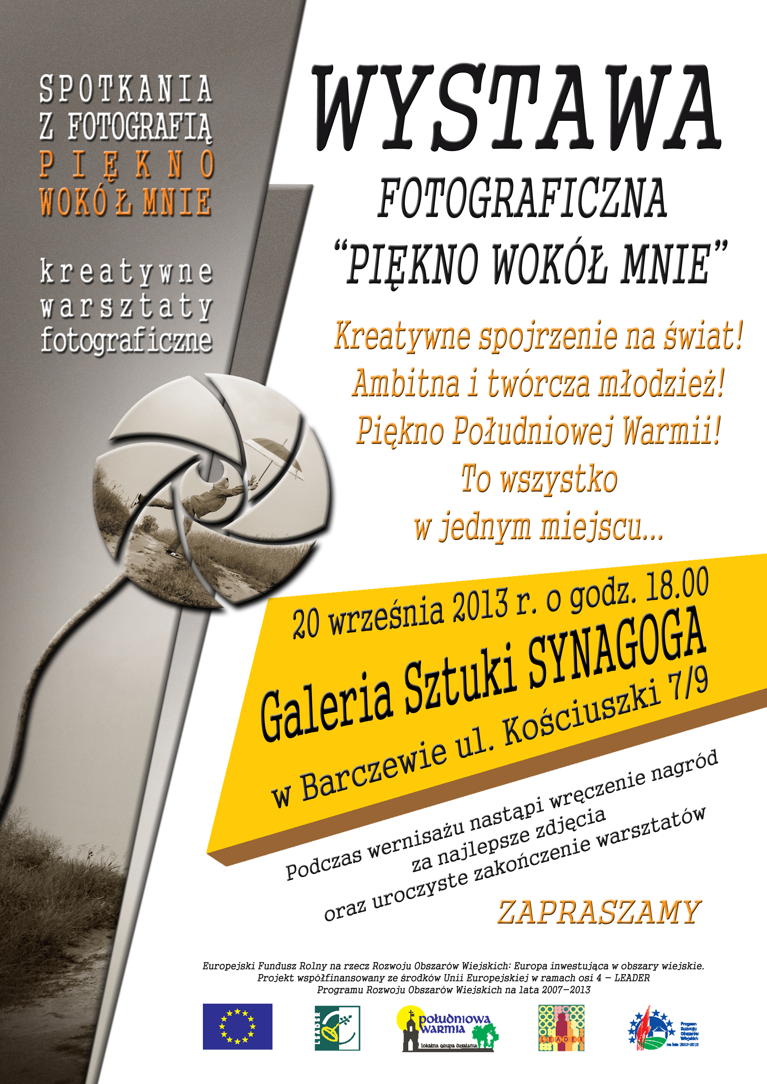 Lokalna Grupa Działania Stowarzyszenie „Południowa Warmia” zaprasza na wernisaż wystawy zdjęć wykonanych przez młodzież uczestniczącą w warsztatach fotograficznych pt. „Piękno wokół mnie”, który odbędzie się w piątek 20 września o godz. 18.00 w Galerii Sztuki SYNAGOGA w Barczewie.
