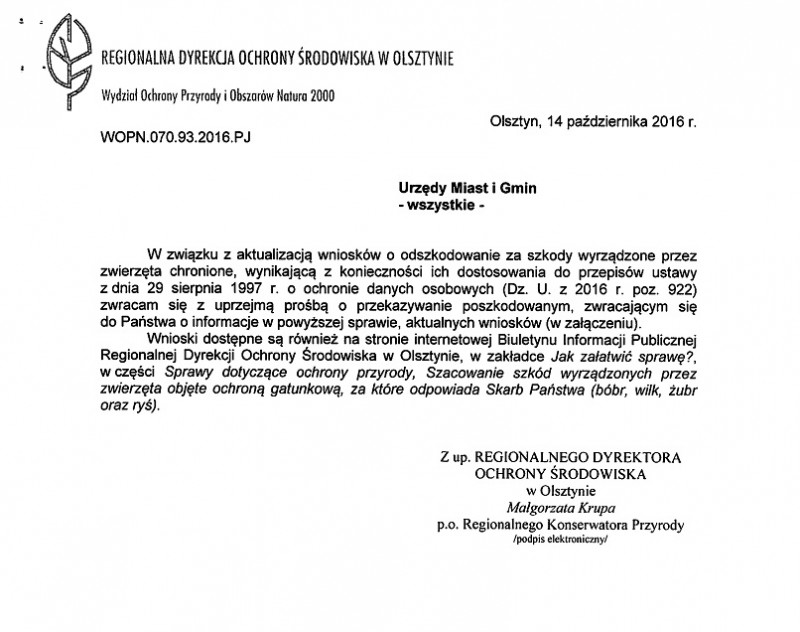 Informacja RDOŚ w Olsztynie dotycząca wniosków o odszkodowania za szkody wyrządzone przez zwierzęta chronione.