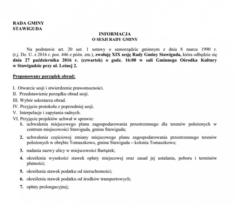 Na podstawie art. 20 ust. 1 ustawy o samorządzie gminnym z dnia 8 marca 1990 r. (t.j. Dz. U. z 2016 r. poz. 446 z późn. zm.), zwołuję XIX sesję Rady Gminy Stawiguda, która odbędzie się dnia 27 października 2016 r. (czwartek) o godz. 16:00 w sali Gminnego Ośrodka Kultury w Stawigudzie przy ul. Leśnej 2.