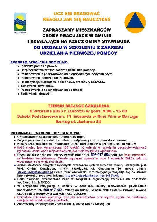 W dniu 9 września 2023 r. (sobota) zapraszamy mieszkańców, osoby pracujące i działające na rzecz Gminy Stawiguda do udziału w szkoleniu z zakresu udzielania pierwszej pomocy. Ilość uczestników jest ograniczona. Obowiązują zapisy wg kolejności zgłoszeń. Program szkolenia i warunki uczestnictwa dostępne są na plakacie.