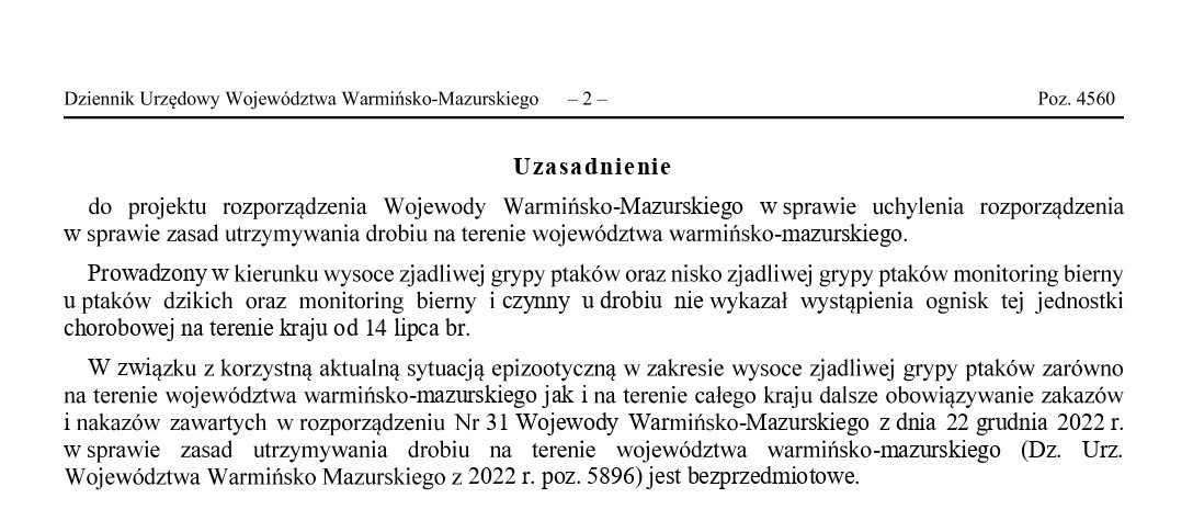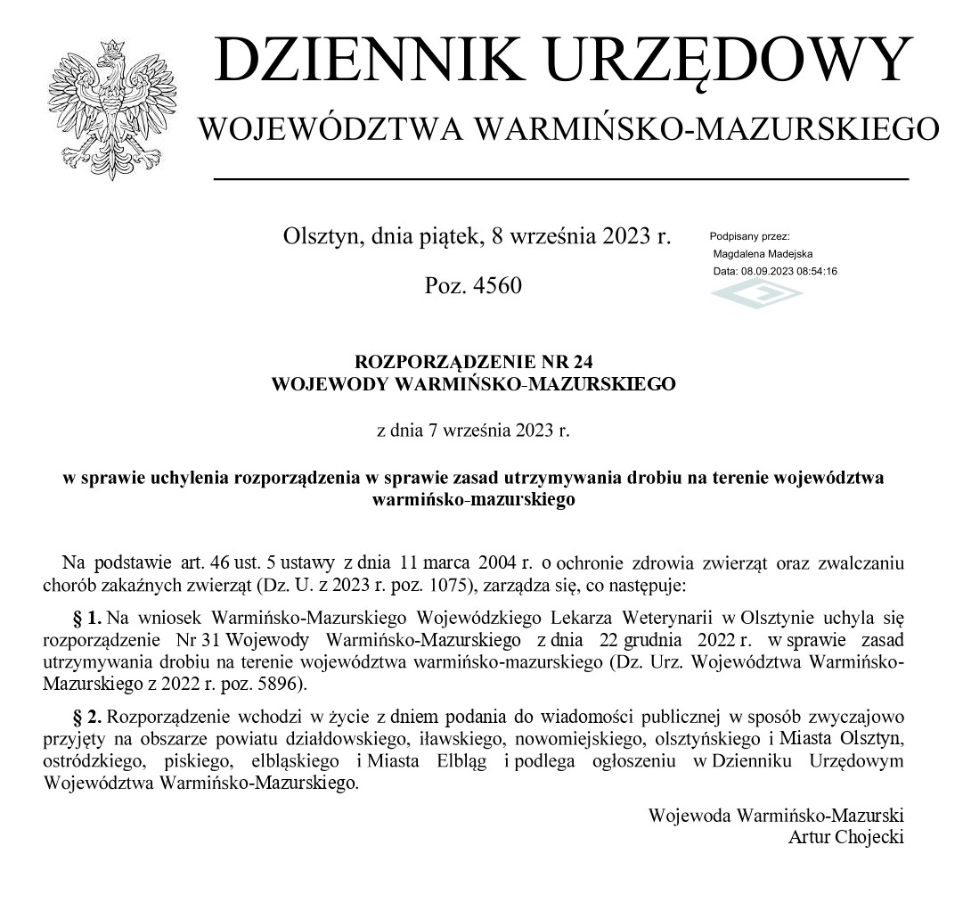 Informacja dot. Rozporządzenia nr 24 Wojewody Warmińsko-Mazurskiego z dnia 7 września 2023 r. w sprawie uchylenia rozporządzenia w sprawie zasad utrzymywania drobiu na terenie województwa warmińsko-mazurskiego.