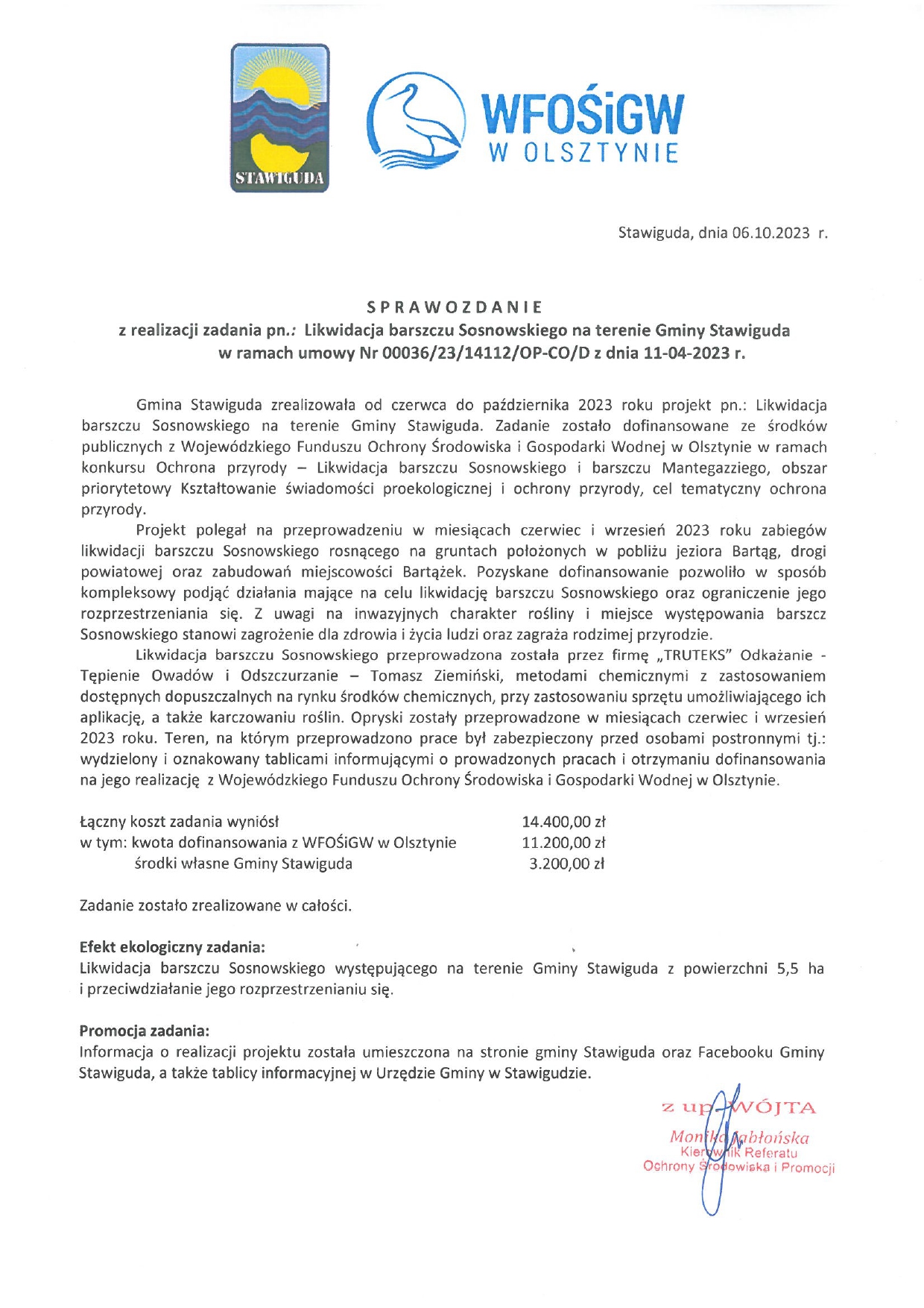 Sprawozdanie z realizacji zadania pn.: Likwidacja barszczu Sosnowskiego na terenie Gminy Stawiguda w ramach umowy Nr 00036/23/14112/OP-CO/D z dnia 11-04-2023 r.