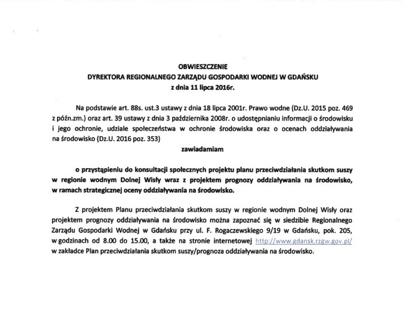 Obwieszczenie Dyrektora Regionalnego Zarządu Gospodarki Wodnej w Gdańsku o przystąpieniu do konsultacji społecznych projektu planu przeciwdziałania skutkom suszy w regionie wodnym Dolnej Wisły wraz z projektem prognozy oddziaływania na środowisko, w ramach strategicznej oceny oddziaływania na środowisko.