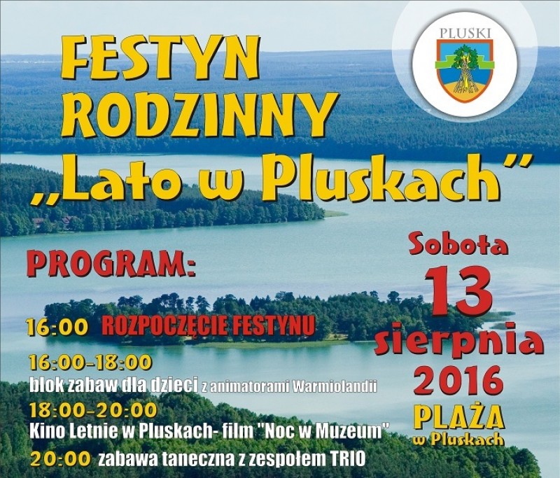 W sobotę 13 sierpnia 2016 na plaży w Pluskach zapraszamy wszystkich chętnych na Festyn Rodzinny "Lato w Pluskach" !