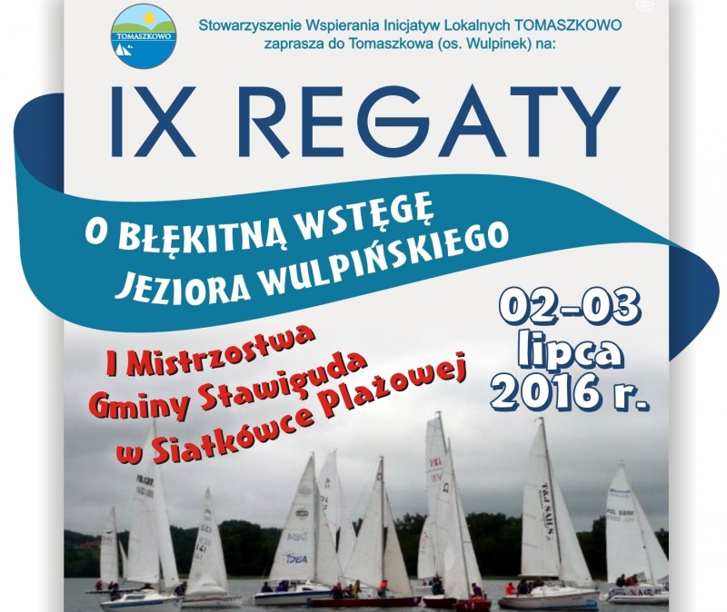 02-03 lipca 2016r. w Tomaszkowie (os. Wulpinek) odbędą się IX Regaty o Błękitną Wstęgę Jeziora Wulipńśkiego oraz I Mistrzostwa Gminy Stawiguda w Siatkówce Plażowej. Serdecznie zapraszamy!