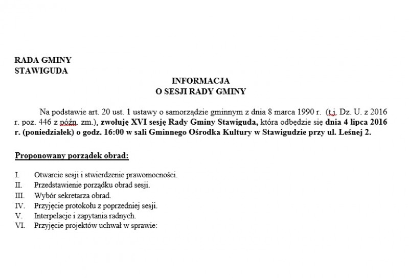Na podstawie art. 20 ust. 1 ustawy o samorządzie gminnym z dnia 8 marca 1990 r. (t.j. Dz. U. z 2016 r. poz. 446 z późn. zm.), zwołuję XVI sesję Rady Gminy Stawiguda, która odbędzie się dnia 4 lipca 2016 r. (poniedziałek) o godz. 16:00 w sali Gminnego Ośrodka Kultury w Stawigudzie przy ul. Leśnej 2.