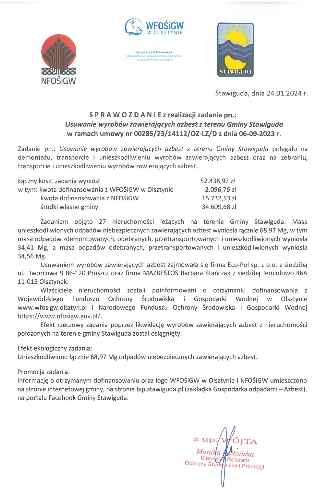 S P R A W O Z D A N I E z realizacji zadania pn.: Usuwanie wyrobów zawierających azbest z terenu Gminy Stawiguda w ramach umowy nr 00285/23/14112/OZ-LZ/D z dnia 06-09-2023 r.