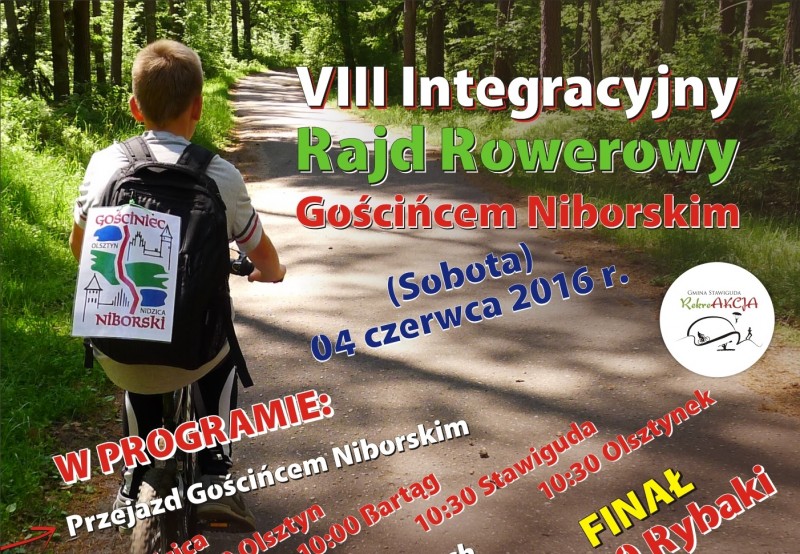 Serdecznie zapraszamy na VIII Integracyjny Rajd Rowerowy Gościńcem Niborskim, który odbędzie się w sobotę 4 czerwca 2016 r. Startujemy z różnych punktów: Olsztyna, Stawigudy, Olsztynka i Nidzicy by spotkać się w Rybakach przy ognisku!