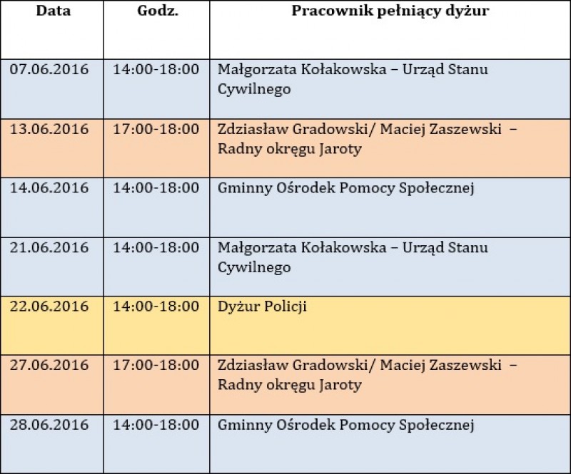 Pracownicy Urzędu Gminy Stawiguda będą przyjmować interesantów w każdy wtorek w godzinach 14:00 – 18:00. Dwa razy w miesiącu w poniedziałki dyżury będą pełnić radni z okręgu Jaroty w godz. 17:00- 18:00 Jeden raz w miesiącu w środę dyżurują Policjanci z Posterunku Policji w Stawigudzie.