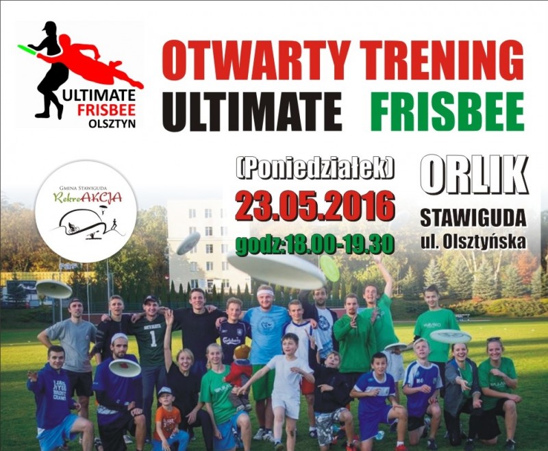 W poniedziałek 23.05.2016 roku w godzinach 18:00-19:30 na orliku w Stawigudzie odbędzie się otwarty trening Ultimate Frisbee!