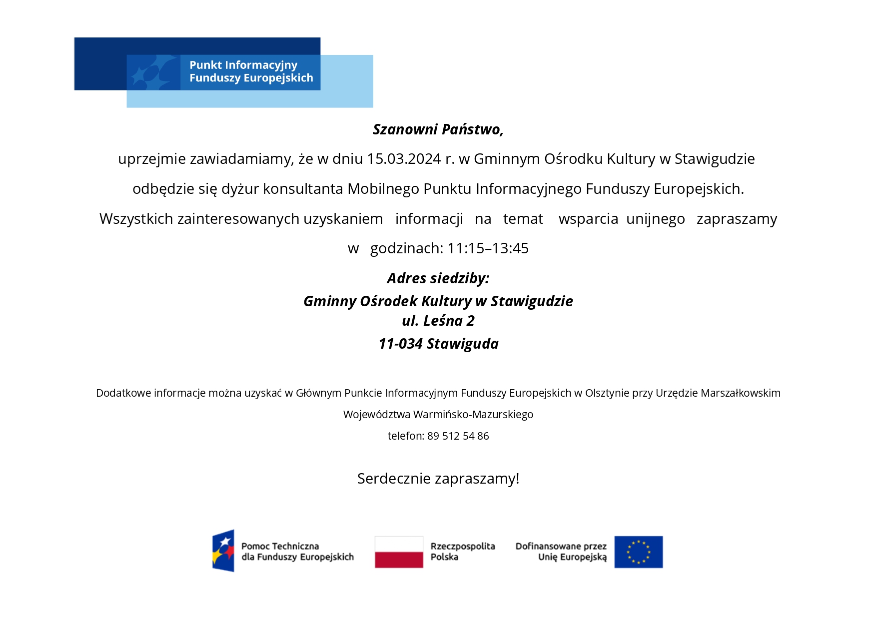 uprzejmie zawiadamiamy, że w dniu 15.03.2024 r. w Gminnym Ośrodku Kultury w Stawigudzie odbędzie się dyżur konsultanta Mobilnego Punktu Informacyjnego Funduszy Europejskich.