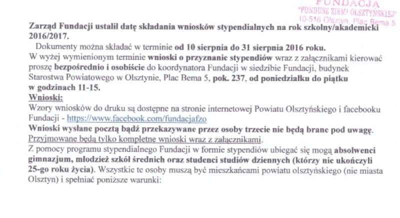 Zarząd Fundacji ustalił datę składania wniosków stypendialnych na rok szkolny/akademicki 2016/2017