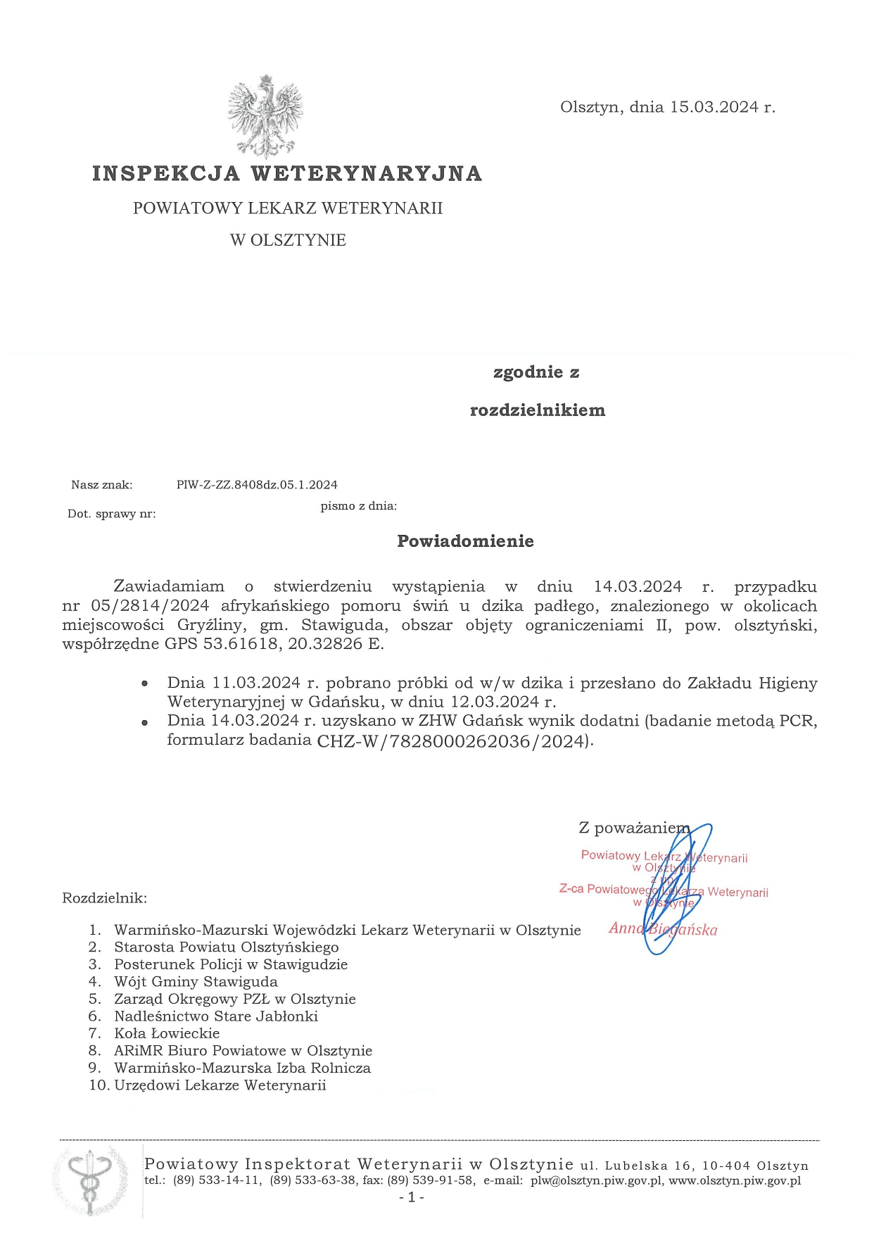 Inspekcja Weterynaryjna Powiatowy Lekarz Weterynarii w Olsztynie zawiadamia o stwierdzeniu wystąpienia w dniu 14.03.2024 r. przypadku nr 05/2814/2024 afrykańskiego pomoru świń u dzika padłego, znalezionego w okolicach miejscowości Gryźliny, gm. Stawiguda, obszar objęty ograniczeniami II, pow. olsztyński, współrzędne GPS 53.61618, 20.32826 E.