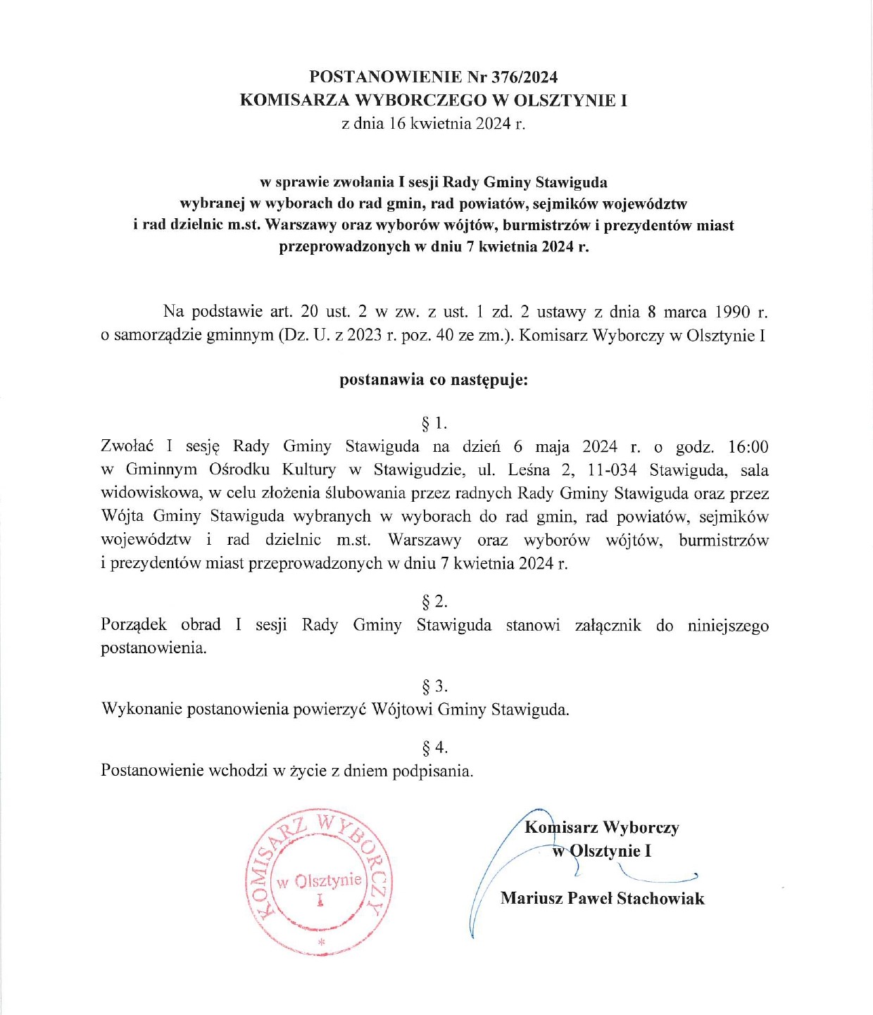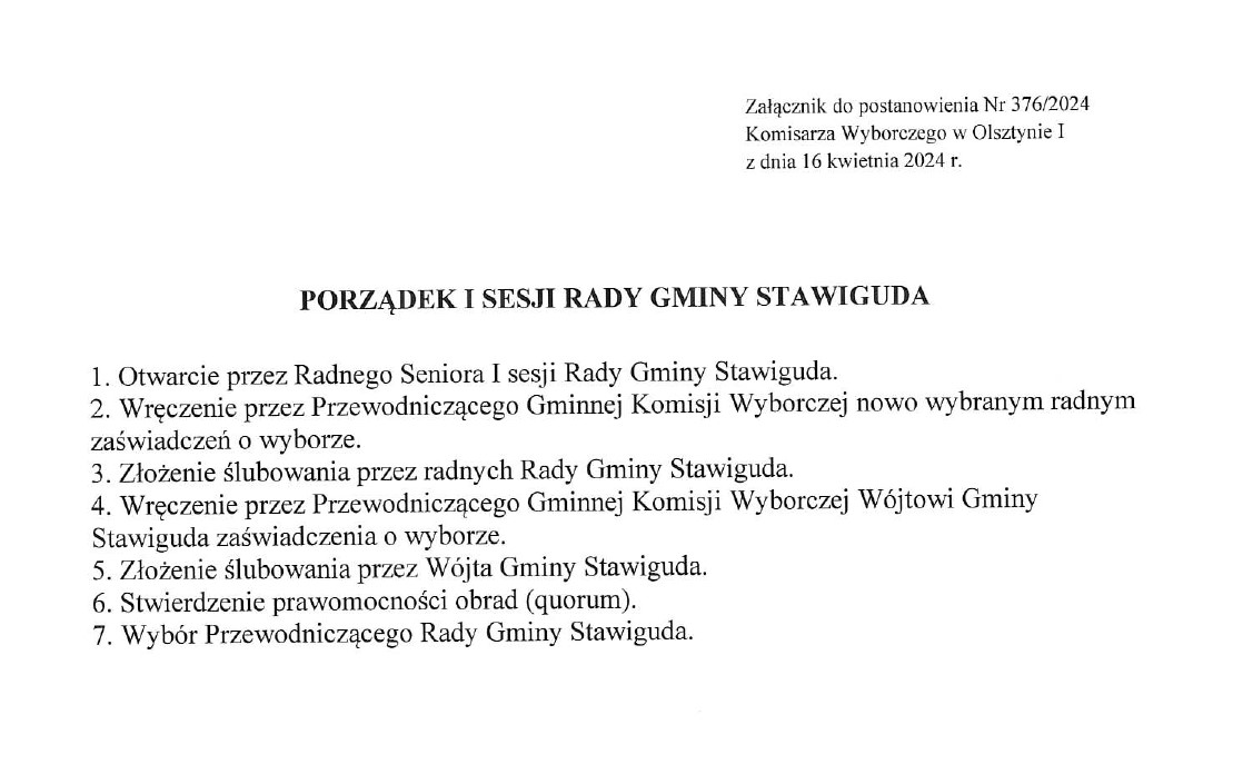 Zwołanie I Sesji Rady Gminy Stawiguda