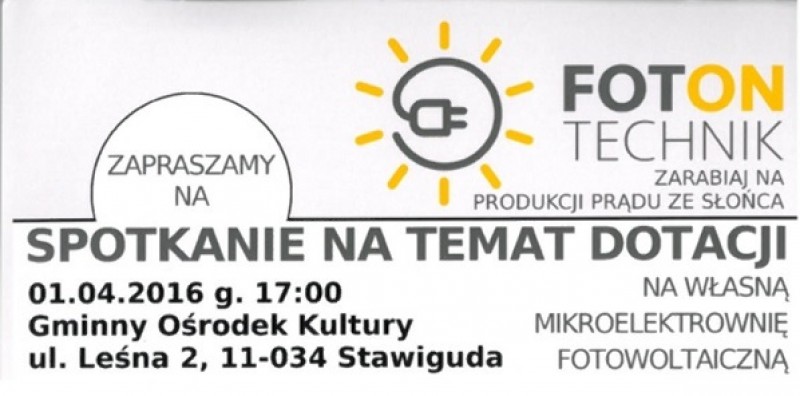 Zapraszamy na spotkanie na temat dotacji na własną mikroelektrownię fotowoltaiczną. 01.04.2016 g.17:00 Gminny Ośrodek Kultury ul. Leśna 2, 11-034 Stawiguda