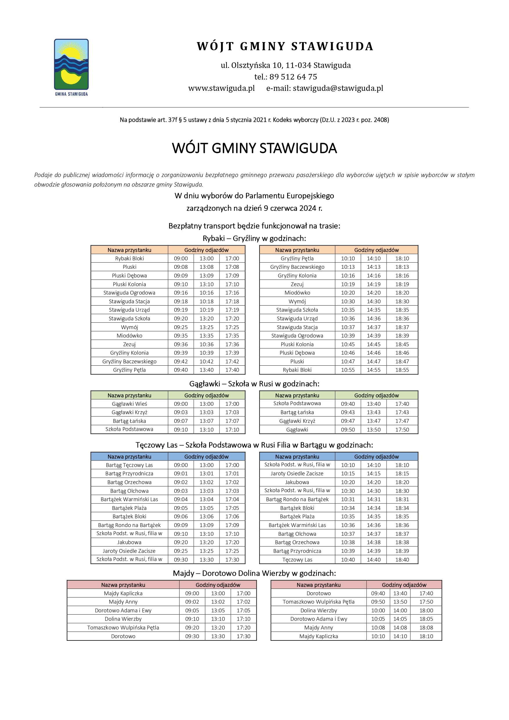Informacja o zorganizowaniu przez Wójta Gminy Stawiguda bezpłatnego gminnego przewozu pasażerskiego dla wyborców ujętych w spisie wyborców w stałym obwodzie głosowania położonym na obszarze gminy Stawiguda.