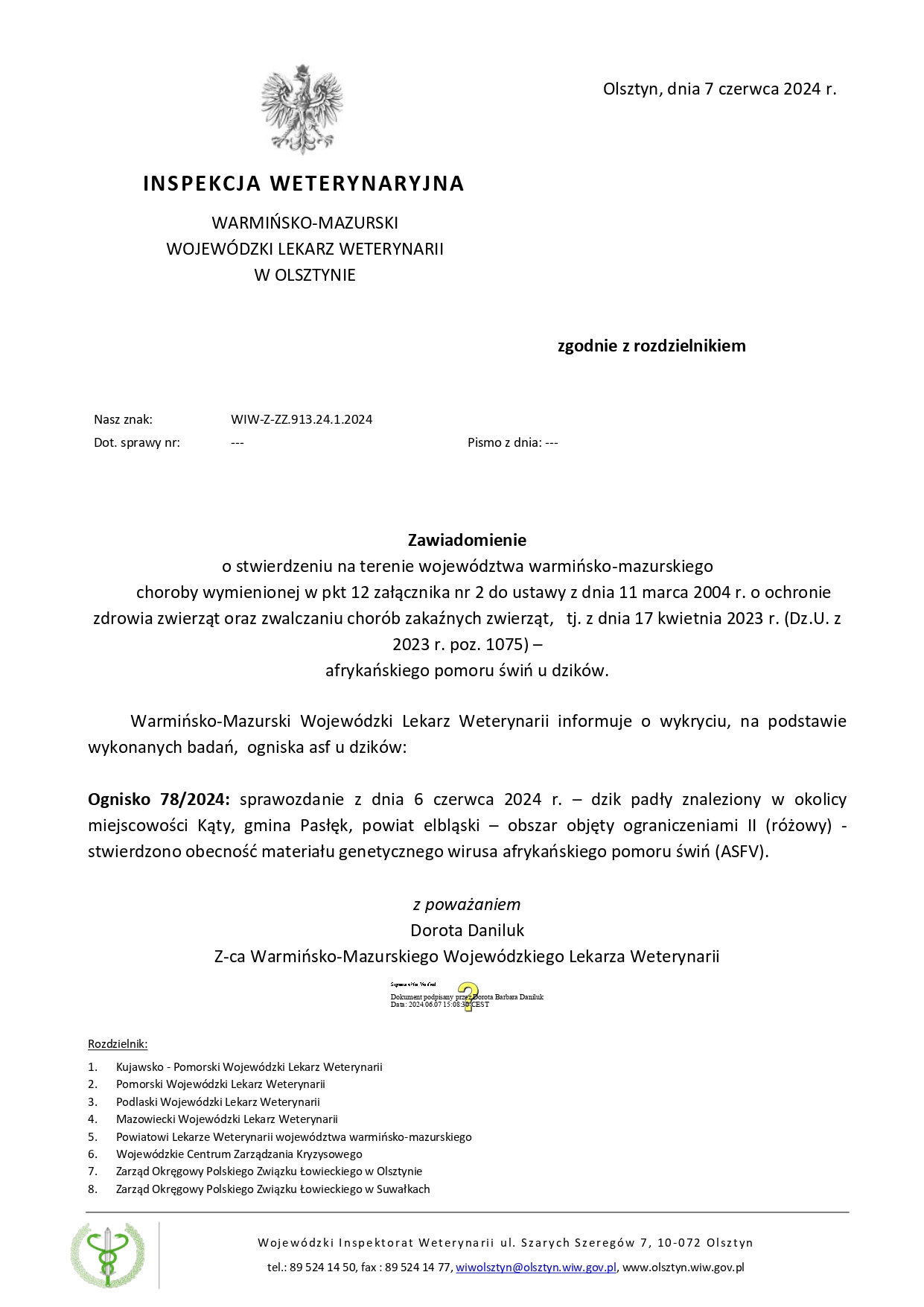 Informujemy, że Warmińsko-Mazurski Wojewódzki Lekarz Weterynarii  wykrył ognisko afrykańskiego pomoru świń u dzików w okolicy miejscowości Kąty, gmina Pasłęk, powiat elbląski.