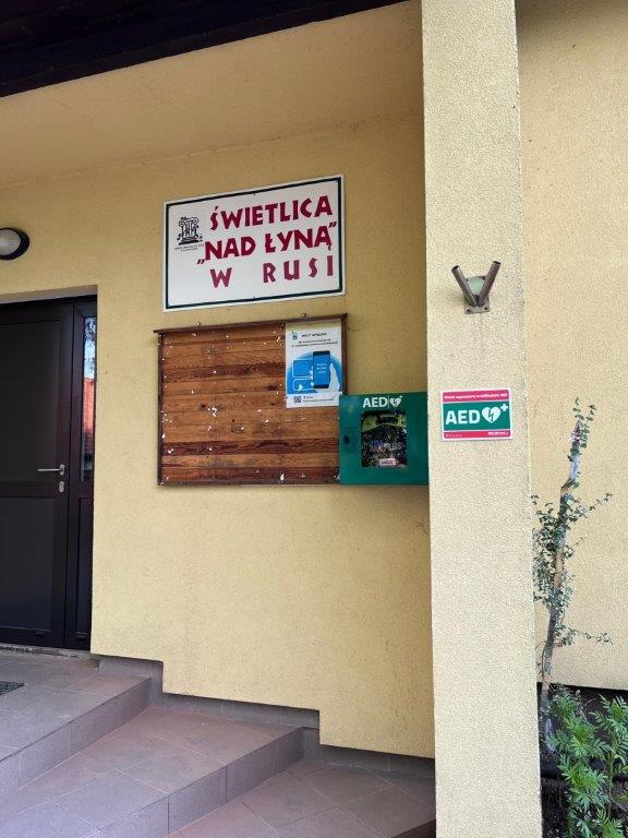 Urząd Gminy Stawiguda informuje o zamontowaniu na ścianie budynku Świetlicy „Nad Łyną” w Rusi defibrylatora AED.