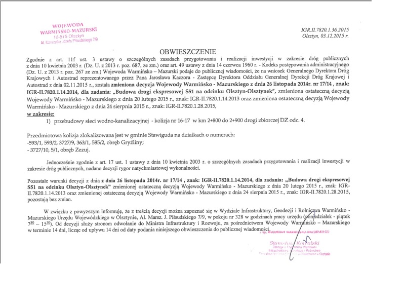 Obwieszczenie w sprawie przebudowy sieci wodno-kanalizacyjnej - kolizja nr 16-17 w km 2+800 do 2+900 drogi zbiorczej DZ odc. 4.