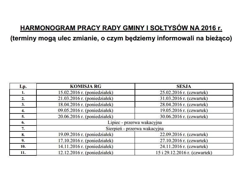Harmonogram pracy Rady Gminy i Sołtysów na 2016 r.