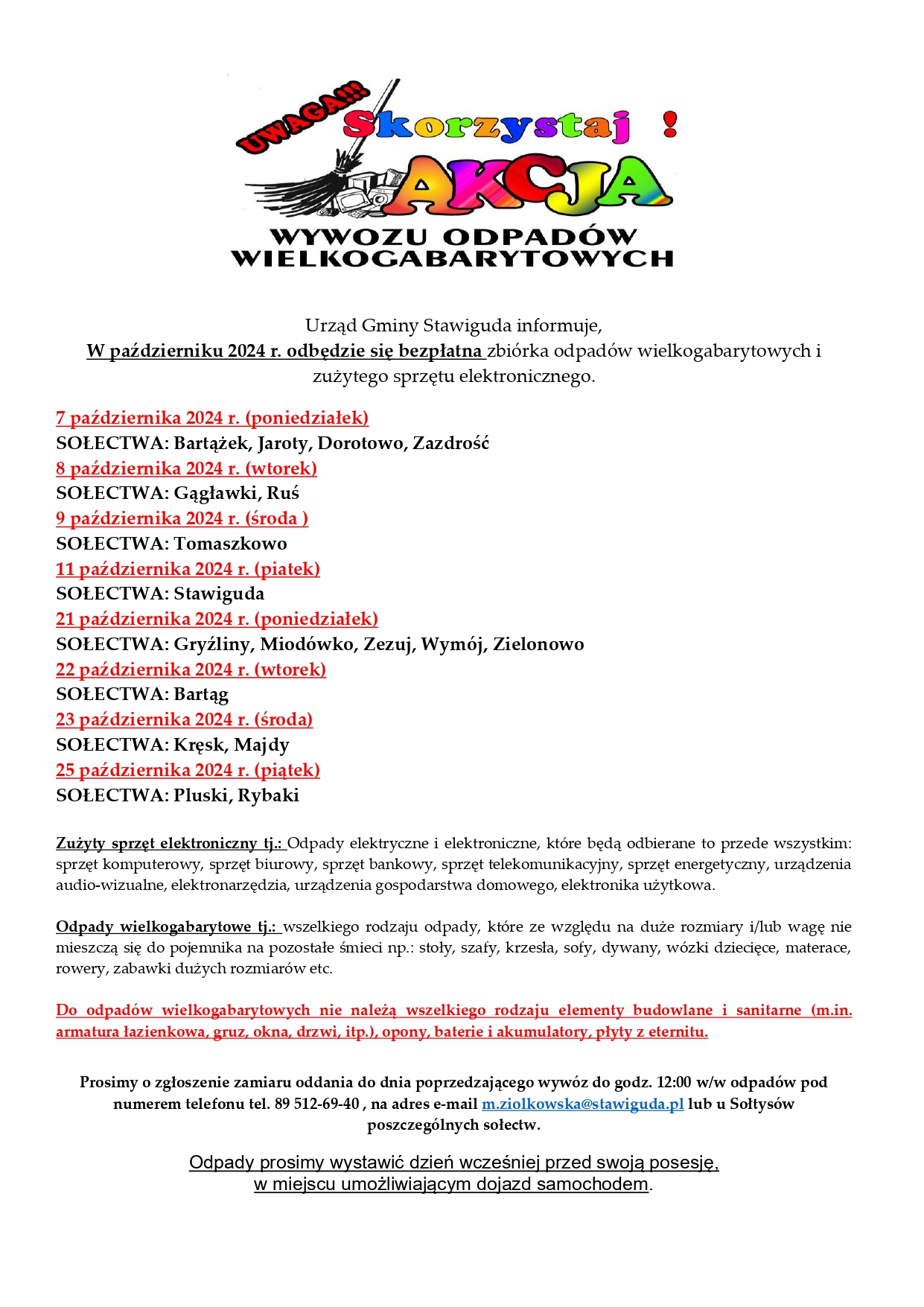 Urząd Gminy Stawiguda informuje, w październiku 2024 r. odbędzie się bezpłatna zbiórka odpadów wielkogabarytowych i zużytego sprzętu elektronicznego dla zabudowy jednorodzinnej
