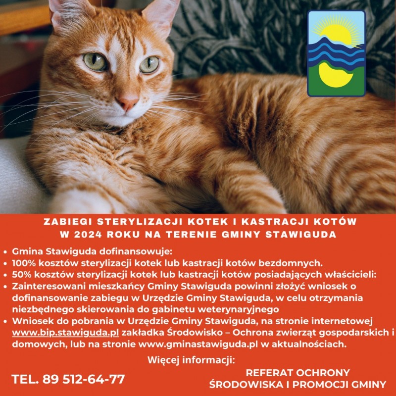 Przypominamy, że w 2024 roku kontynuowana jest akcja sterylizacji kotek i kastracji kotów na terenie Gminy Stawiguda. Zabiegi te stanowią skuteczny sposób ograniczania bezdomności wśród zwierząt oraz niezbędny czynnik pozwalający zapanować nad zwiększaniem się populacji kotów wolno żyjących*, szczególnie licznie występujących na terenach zabudowy rekreacyjnej.