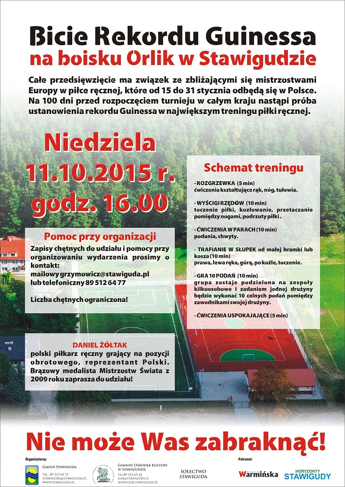 chciałabym poinformować, że zgłoszenie Gminy Stawiguda do ogólnopolskiego Bicia Rekordu Guinessa na Orlikach zostało przyjęte. Organizatorem wydarzenia jest Fundacja Rozwoju Kultury Fizycznej a jej celem jest zorganizowanie największego treningu piłki ręcznej w wielu miejscach jednocześnie (Guiness World Records Official attempt: "Largest handbal training - multiple venues".