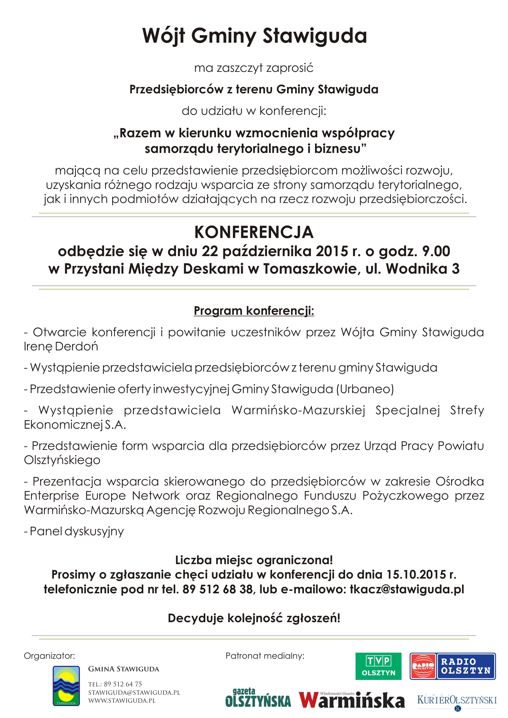 Wójt Gminy Stawiguda ma zaszczyt zaprosić Przedsiębiorców z terenu Gminy Stawiguda do udziału w konferencji: "Razem w kierunku wzmoc nienia współpracy samorządu terytorialnego i biznesu" Konferencja odbędzie się w dniu 22 października 2015 r. o godz. 9:00 w Przystani Między Deskami W Tomaszkowie, ul. Wodnika 3