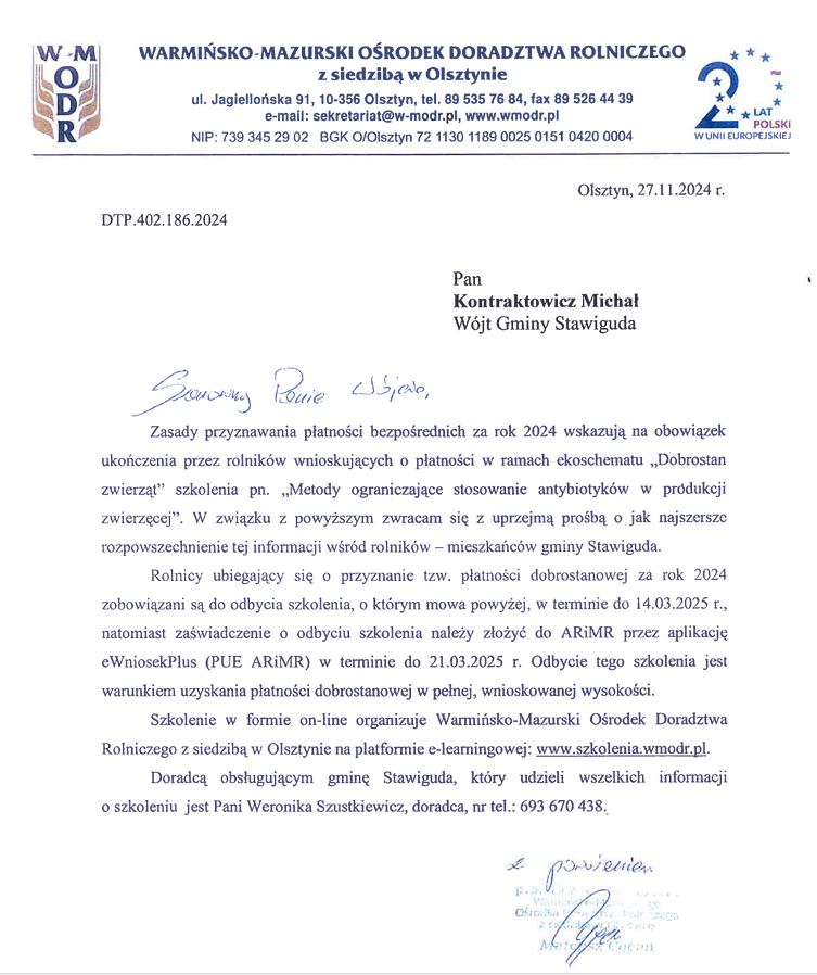 Warmińsko - Mazurski Ośrodek Doradztwa Rolniczego z siedzibą w Olsztynie informuje o obowiązku ukończenia przez rolników wnioskujących o płatność w ramach ekoschematu " Dobrostan zwierząt" szkolenia pn. "Metody ograniczające stosowanie antybiotyków w produkcji zwierzęcej" - szczegóły w załączonym piśmie.