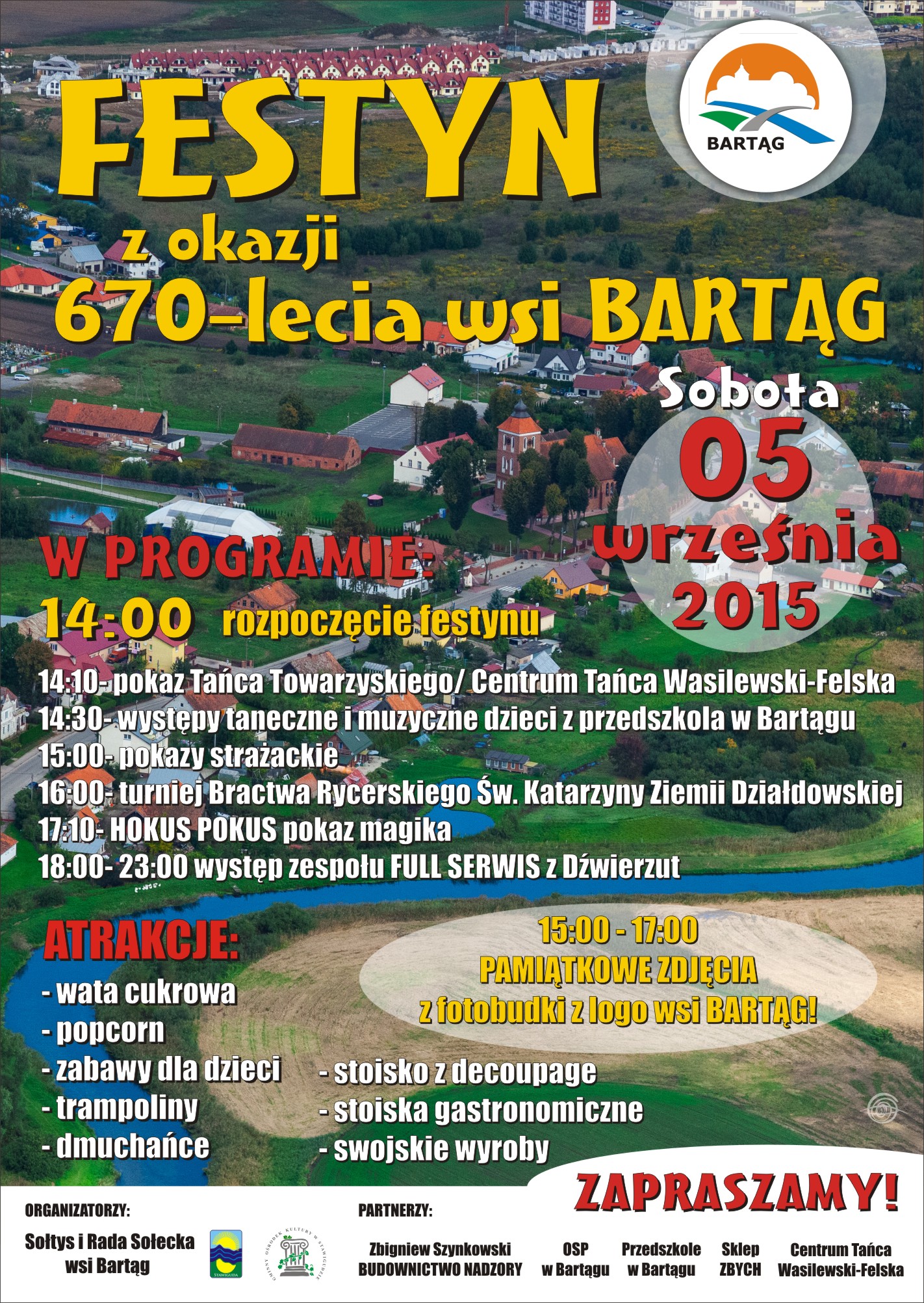 Sołtys i Rada Sołecka wraz Bartąg ze współorganizatorami oraz partnerami zapraszają na FESTYN z okazji 670-lecia wsi BARTĄG, który odbędzie się w sobotę 5 września 2015 r.