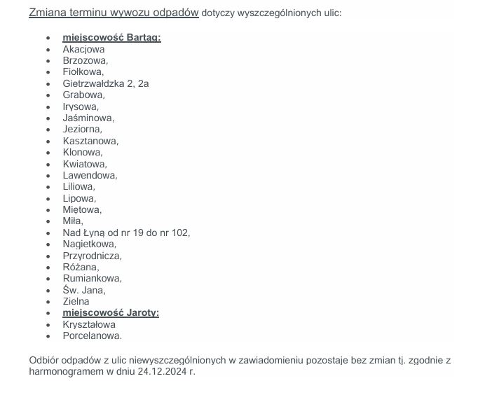 Informacja o zmianie terminu wywozu odpadów zmieszanych z miejscowości Bartąg i Jaroty
