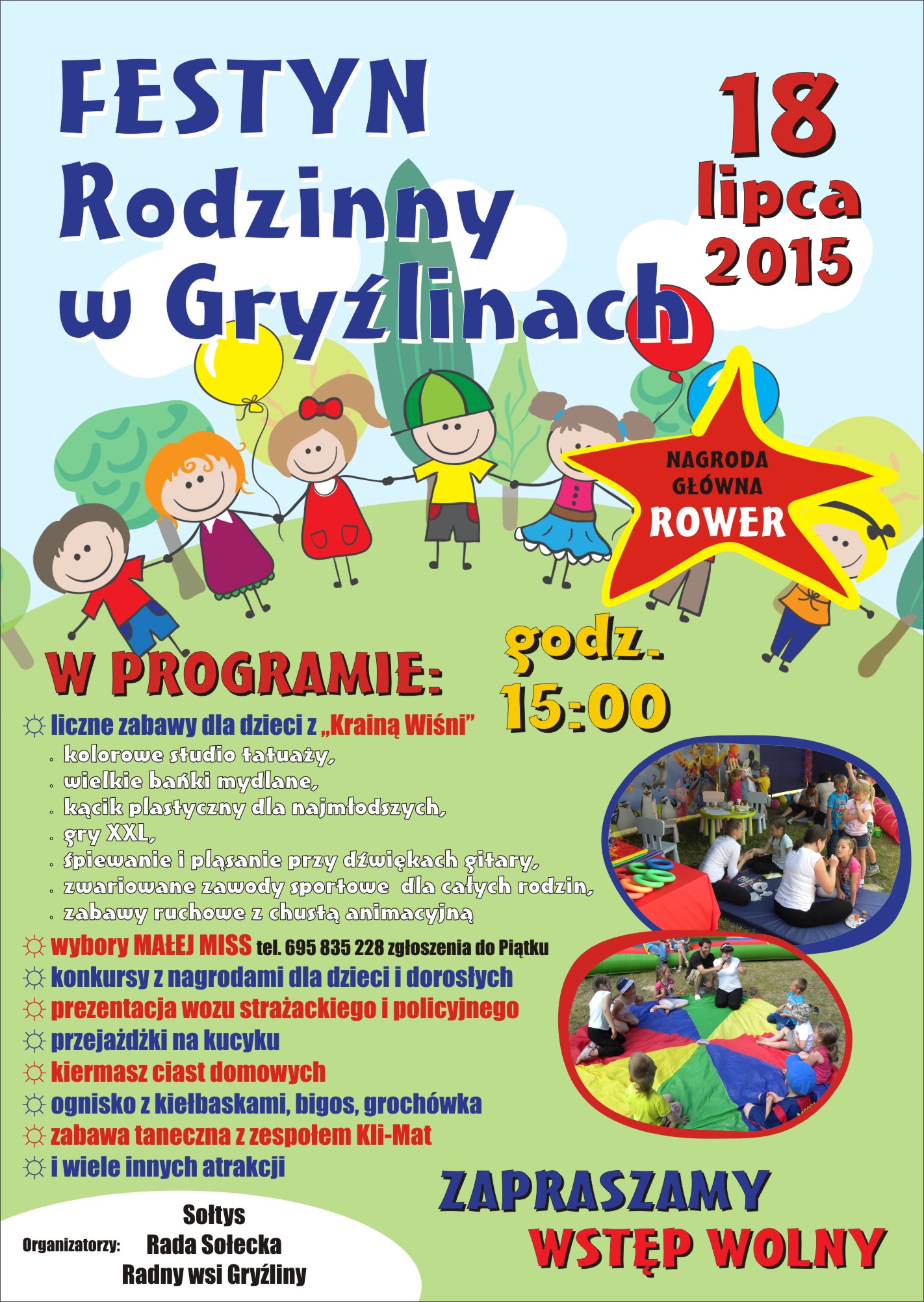 17 lipca 2015 r. był dla mieszkańców sołectwa Gryźliny – Zielonowo dniem bardzo aktywnym i pełnym wrażeń. Tego dnia w Gryźlinach odbył się Festyn Rodzinny. Bogaty program festynu oraz wspaniała pogoda sprawiły, że w festynie wzięło udział wielu mieszkańców wsi oraz liczni goście. Dla wszystkich przygotowano mnóstwo atrakcji, aby każdy uczestnik festynu znalazł coś dla siebie.....