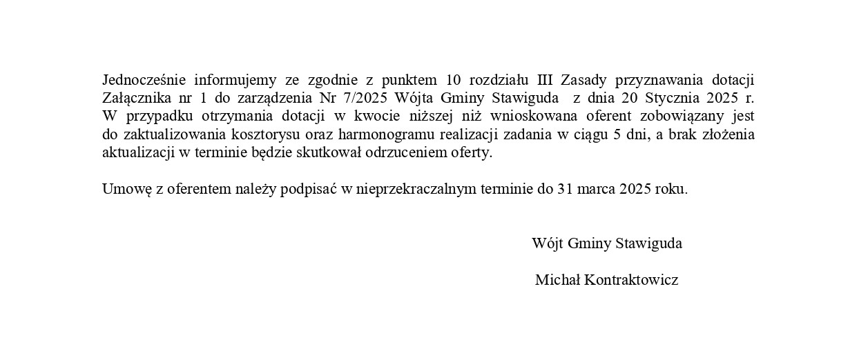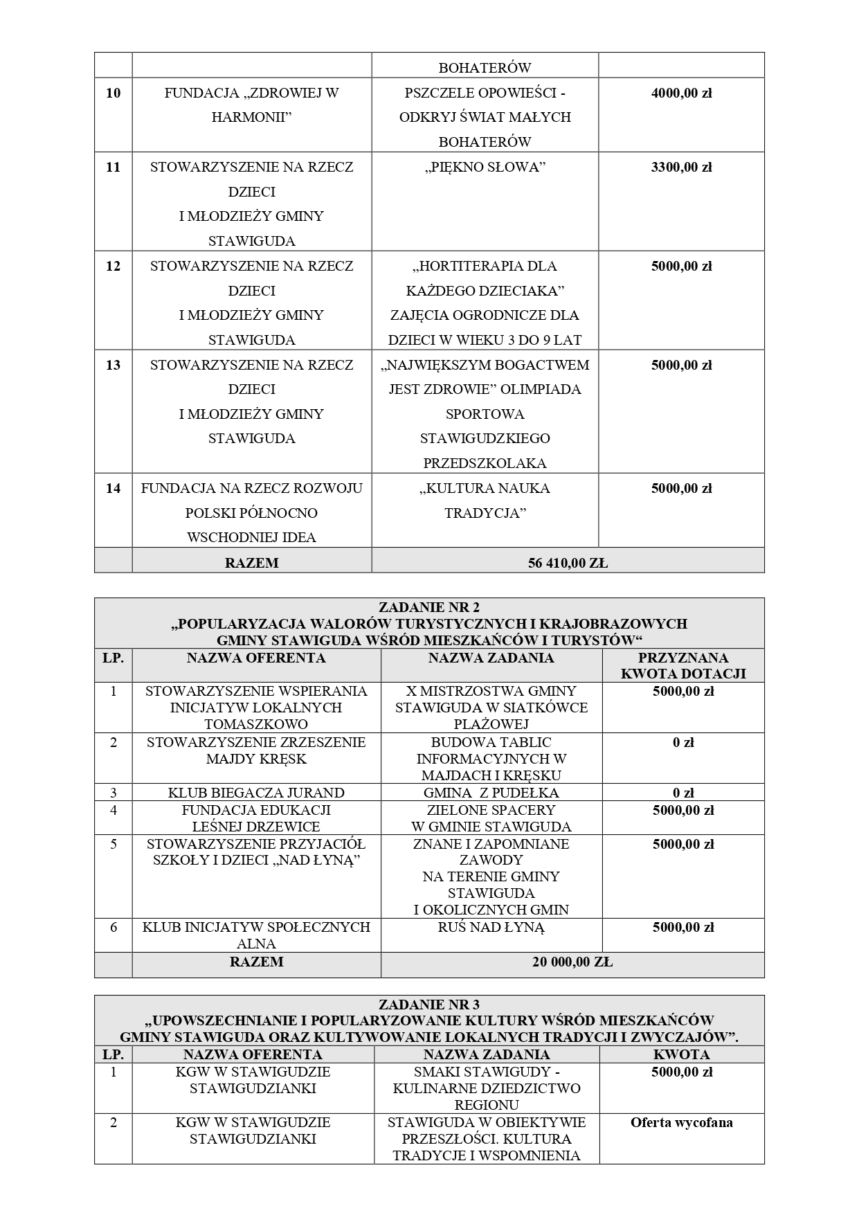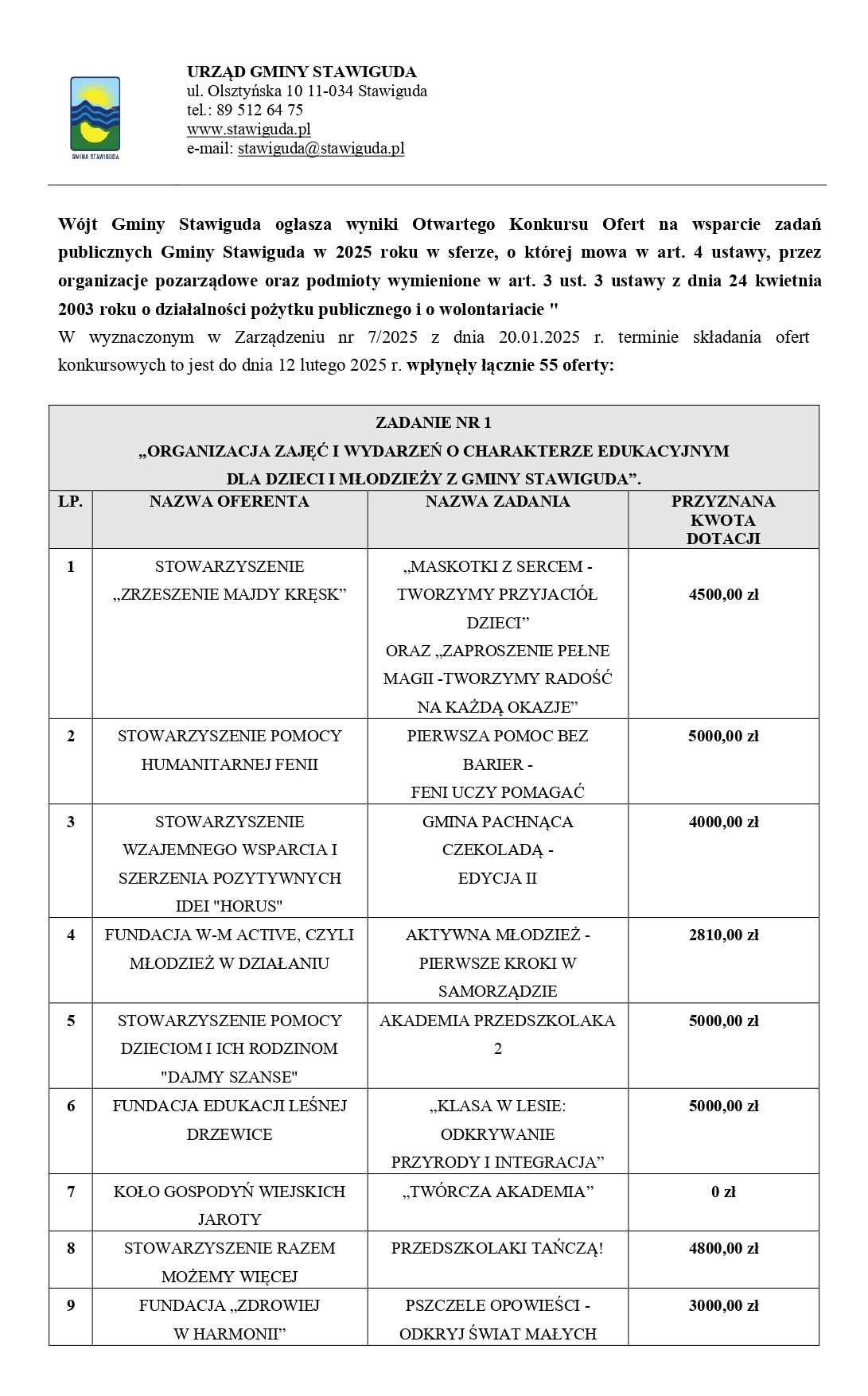 Wójt Gminy Stawiguda ogłasza wyniki Otwartego Konkursu Ofert na wsparcie zadań publicznych