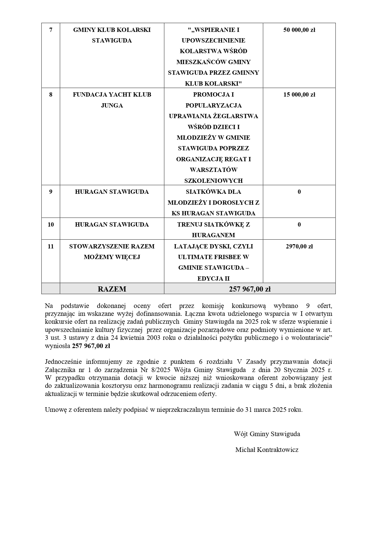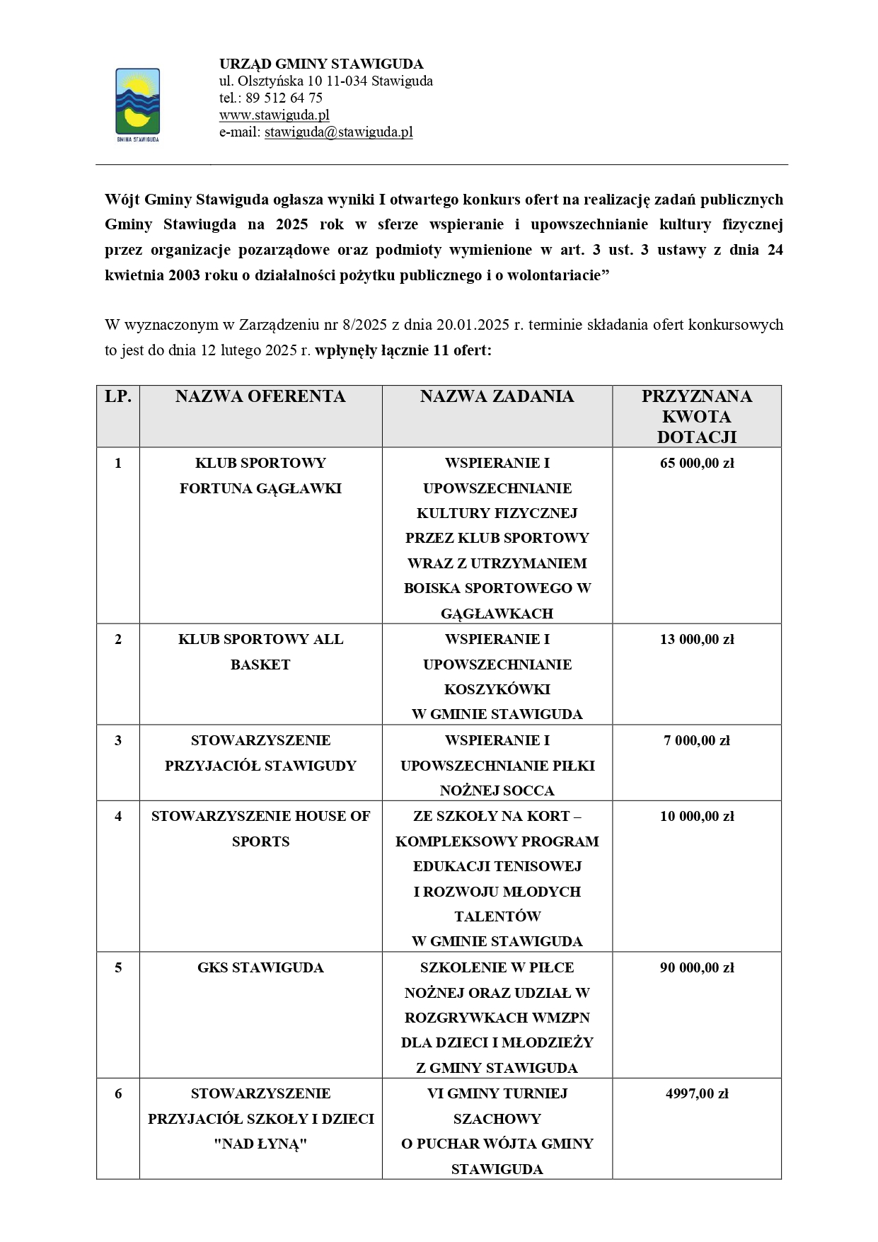 Wójt Gminy Stawiguda ogłasza wyniki I otwartego konkurs ofert na realizację zadań publicznych  Gminy Stawiugda na 2025 rok w sferze wspieranie i upowszechnianie kultury fizycznej przez organizacje pozarządowe oraz podmioty wymienione w art. 3 ust. 3 ustawy z dnia 24 kwietnia 2003 roku o działalności pożytku publicznego i o wolontariacie”