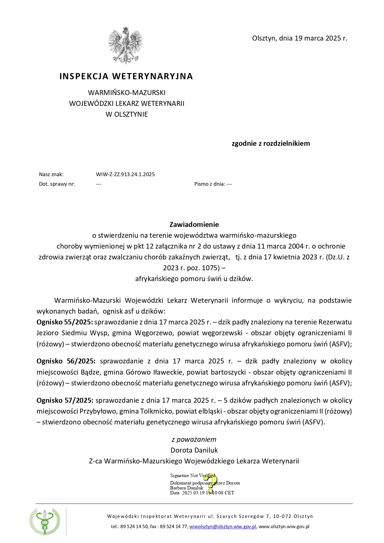 Warmińsko-Mazurski Wojewódzki Lekarz Weterynarii informuje o wykryciu, na podstawie wykonanych badań, ognisk asf u dzików: