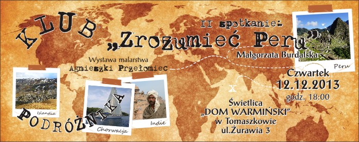 Kolejne spotkanie podróżnicze za nami. 12 grudnia 2013 r. o godzinie 18:00 w świetlicy „Dom Warmiński” w Tomaszkowie spotkaliśmy się by posłuchać opowieści Pani Małgorzaty Burdalskiej o Peru.