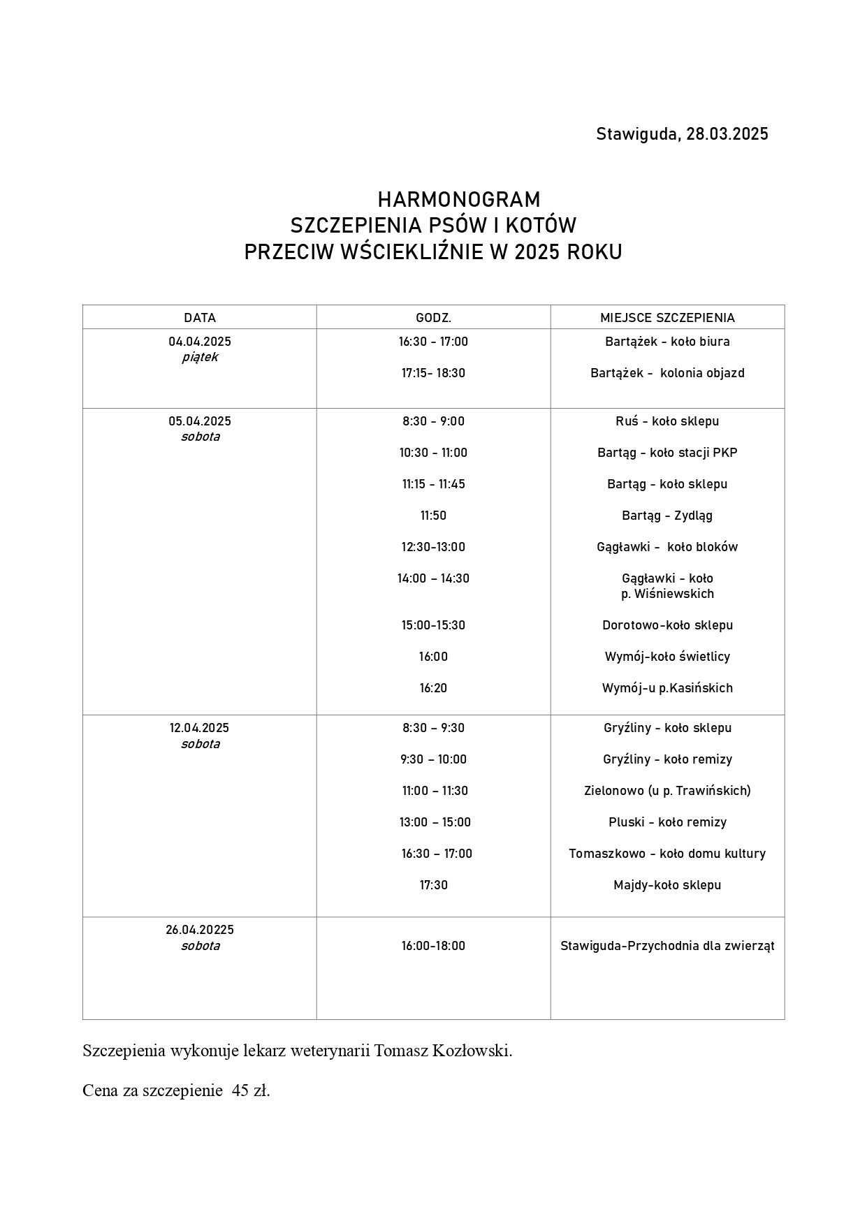 📍 Szczepienia będą przeprowadzał lekarz weterynarii Tomasz Kozłowski.