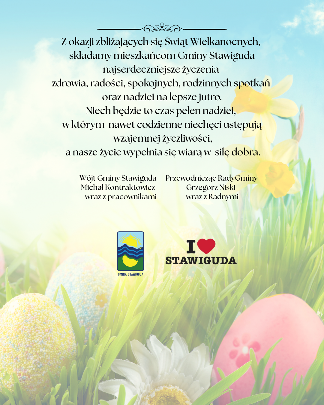Życzenia z okazji Świąt Wielkanocnych od Wójta Gminy Stawiguda Michała Kontraktowicza oraz Grzegorza Niskiego Przewodniczącego Rady Gminy,
