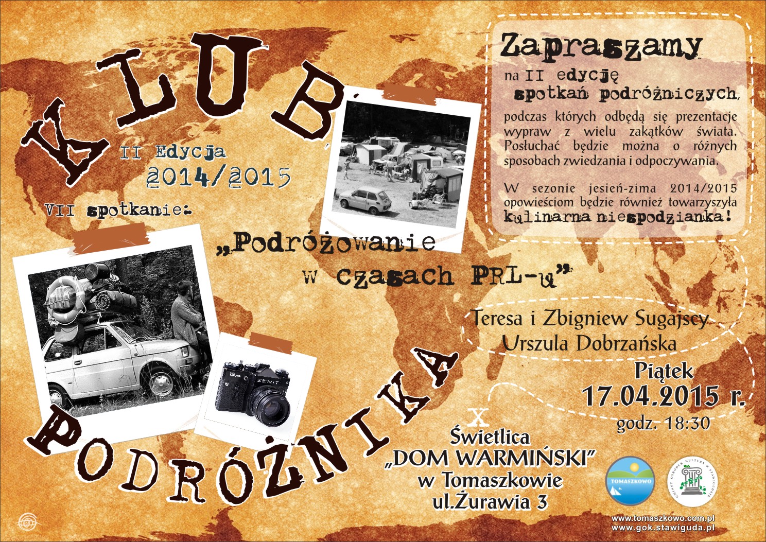 W piątek 17 kwietnia 2015 r. w świetlicy Tomaszkowie odbyło się ostatnie spotkanie II edycji KLUBU PODRÓŻNIKA. Tematem było "Podróżowanie w czasach PRL-u". O swej podróży opowiedziała założycielka klubu Urszula Dobrzańska oraz jego sympatycy Teresa i Zbigniew Sugajscy.